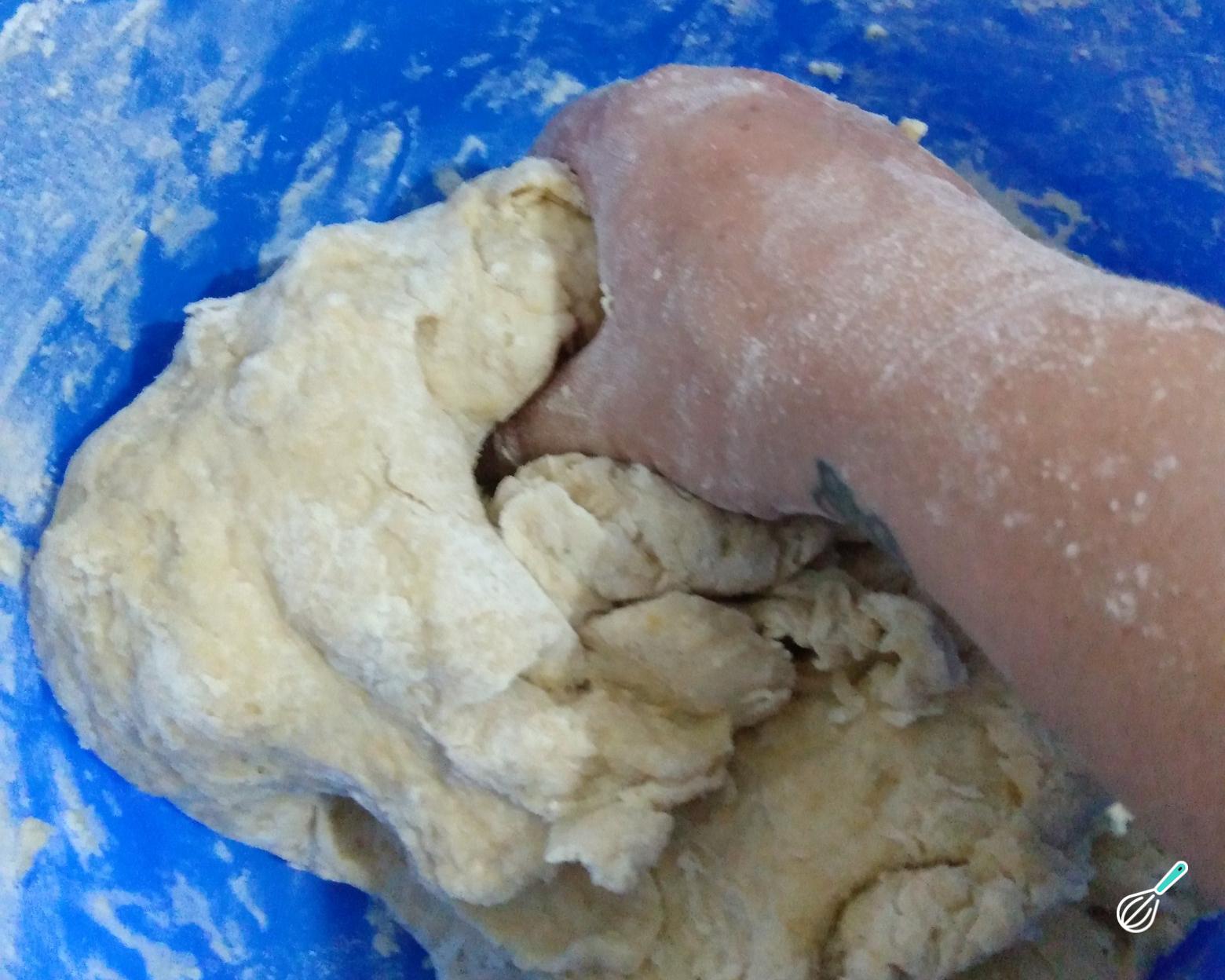 Em seguida vá adicionando o leite morno ou, se preferir, a água morna, e vá misturando com as mãos. Se a ficar muito grudenta, adicione farinha de trigo aos poucos.