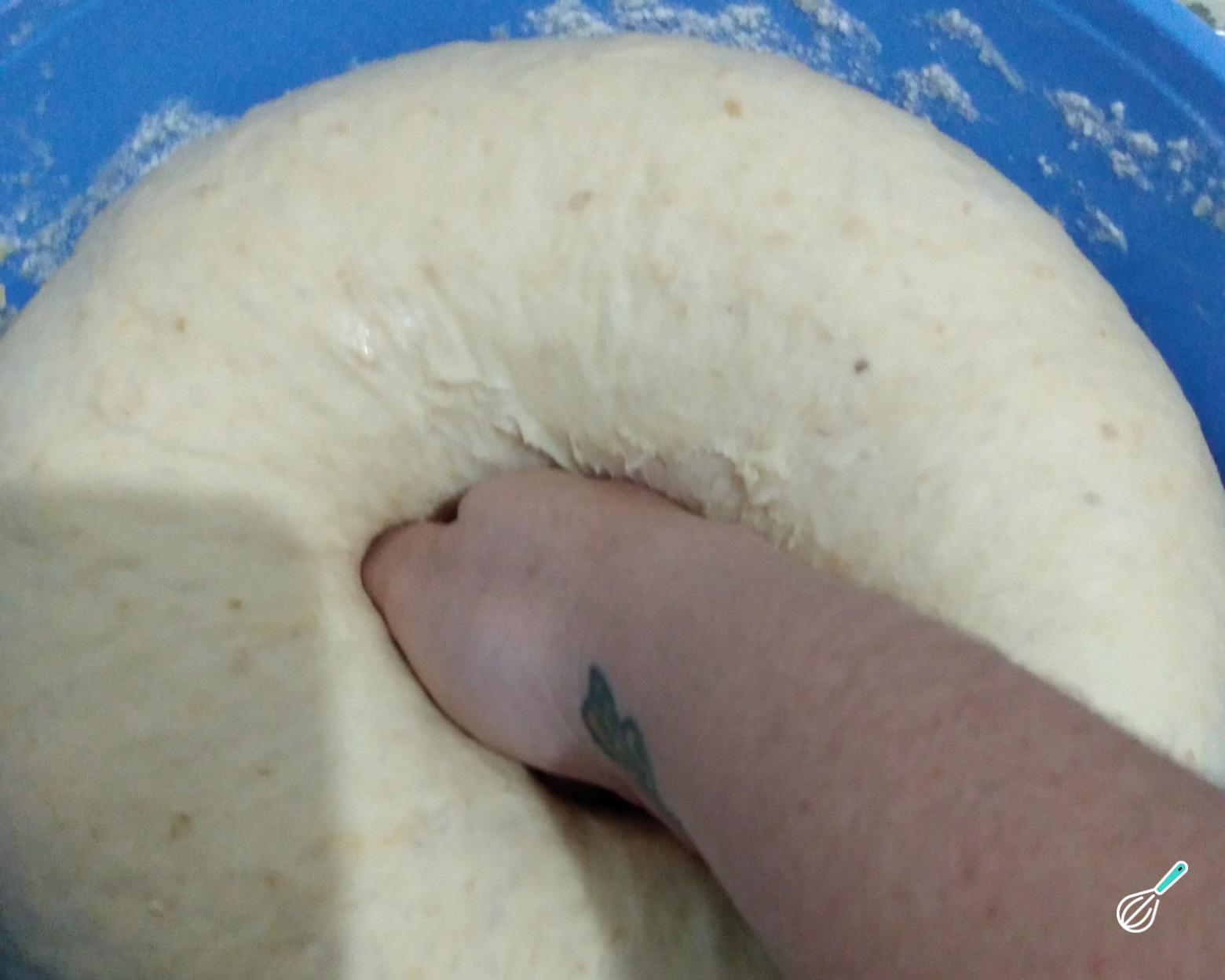 Deixe a massa descansar em um refratário grande com tampa até dobrar de volume. Quando ela dobrar de volume (o tempo para isso varia de acordo com a temperatura ambiente), tire o ar da massa apertando ela com o punho, como na foto.