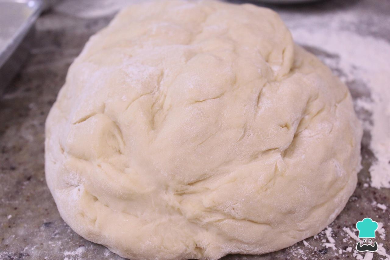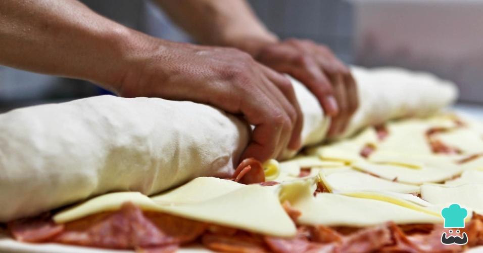 Divida a massa em dois, modele em forma de bola e deixe repousar por 15-30 minutos tampada. Depois abra as duas metades em forma de retângulo e espalhe sobre elas o recheio, que será a linguiça e a mussarela.