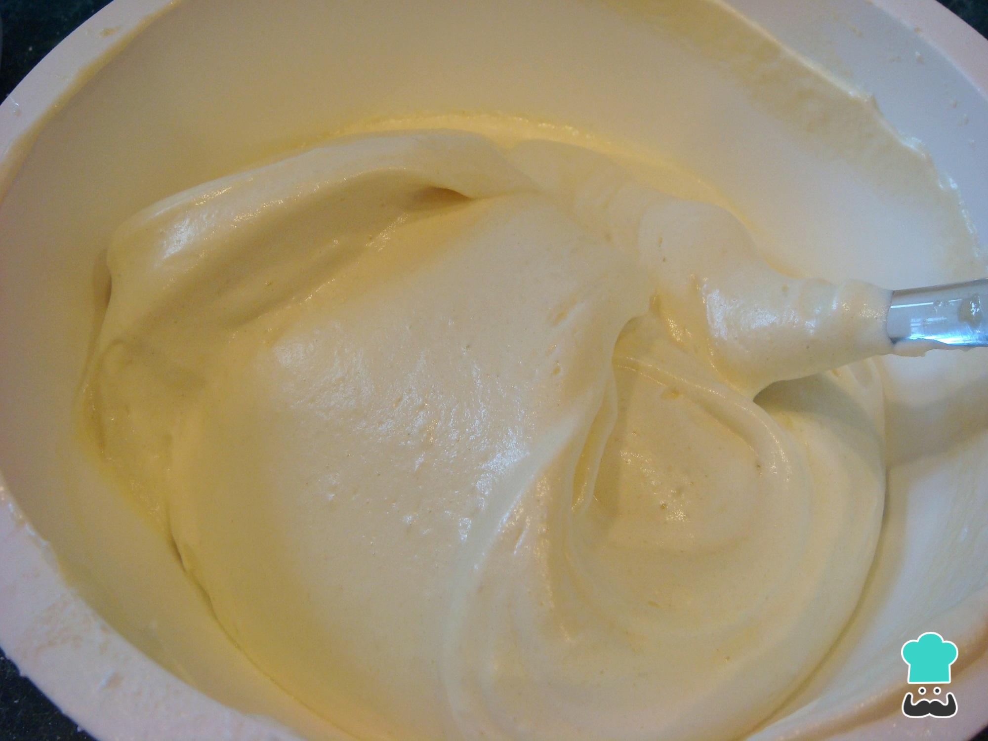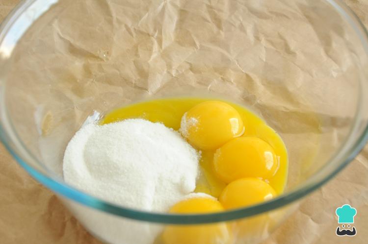 O primeiro passo esta receita prática e econômica é separar os ovos e bater as gemas com o açúcar, até virar uma espuma cremosa.