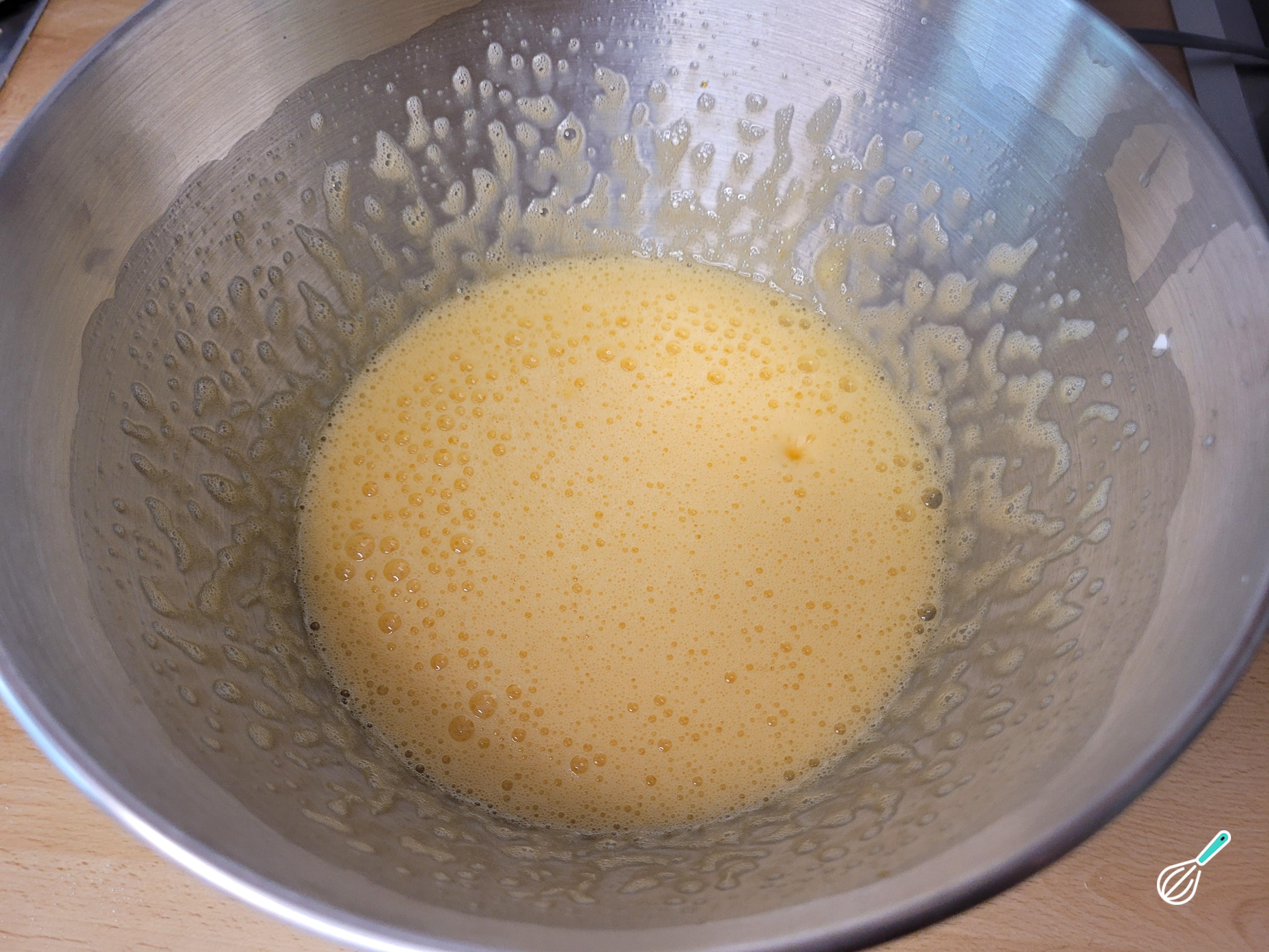 Adicione os ovos e o açúcar na tigela de uma batedeira e bata em velocidade média por uns 10 minutos até espumar, chegar numa textura cremosa e cor amarelo claro.
