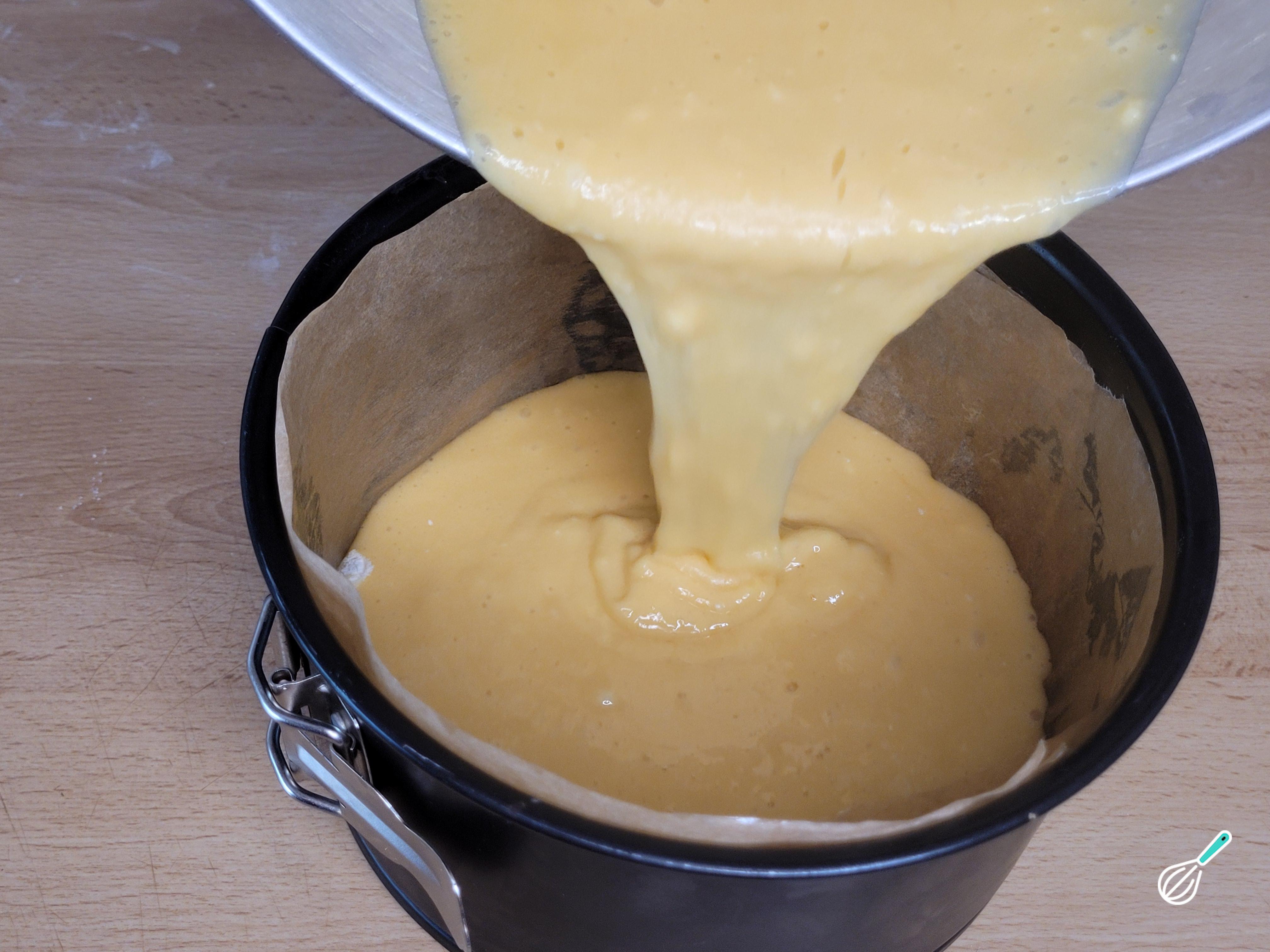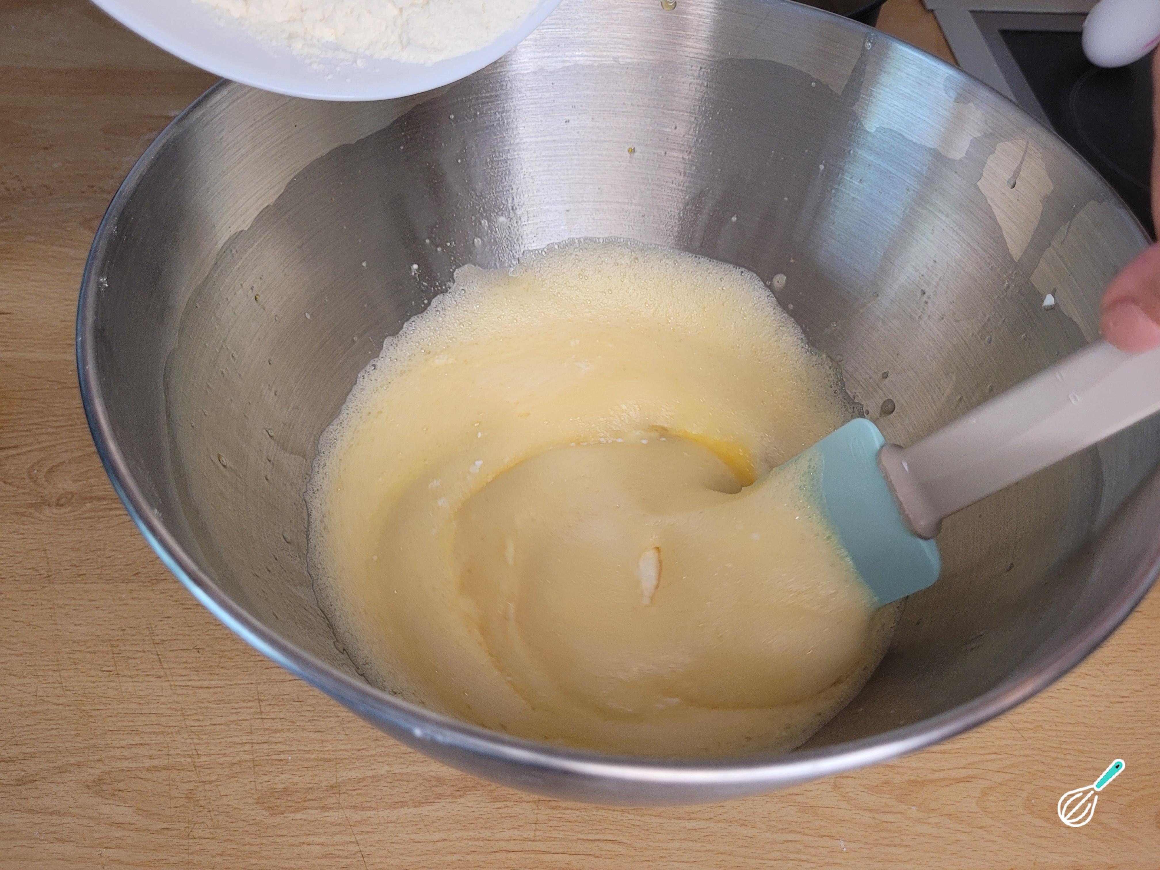 Quando a mistura de ovos e açúcar tiver quase dobrado de tamanho, desligue, adicione a farinha aos poucos e vá mexendo com uma espátula, sem bater, incorporando de baixo para cima para não perder o ar.