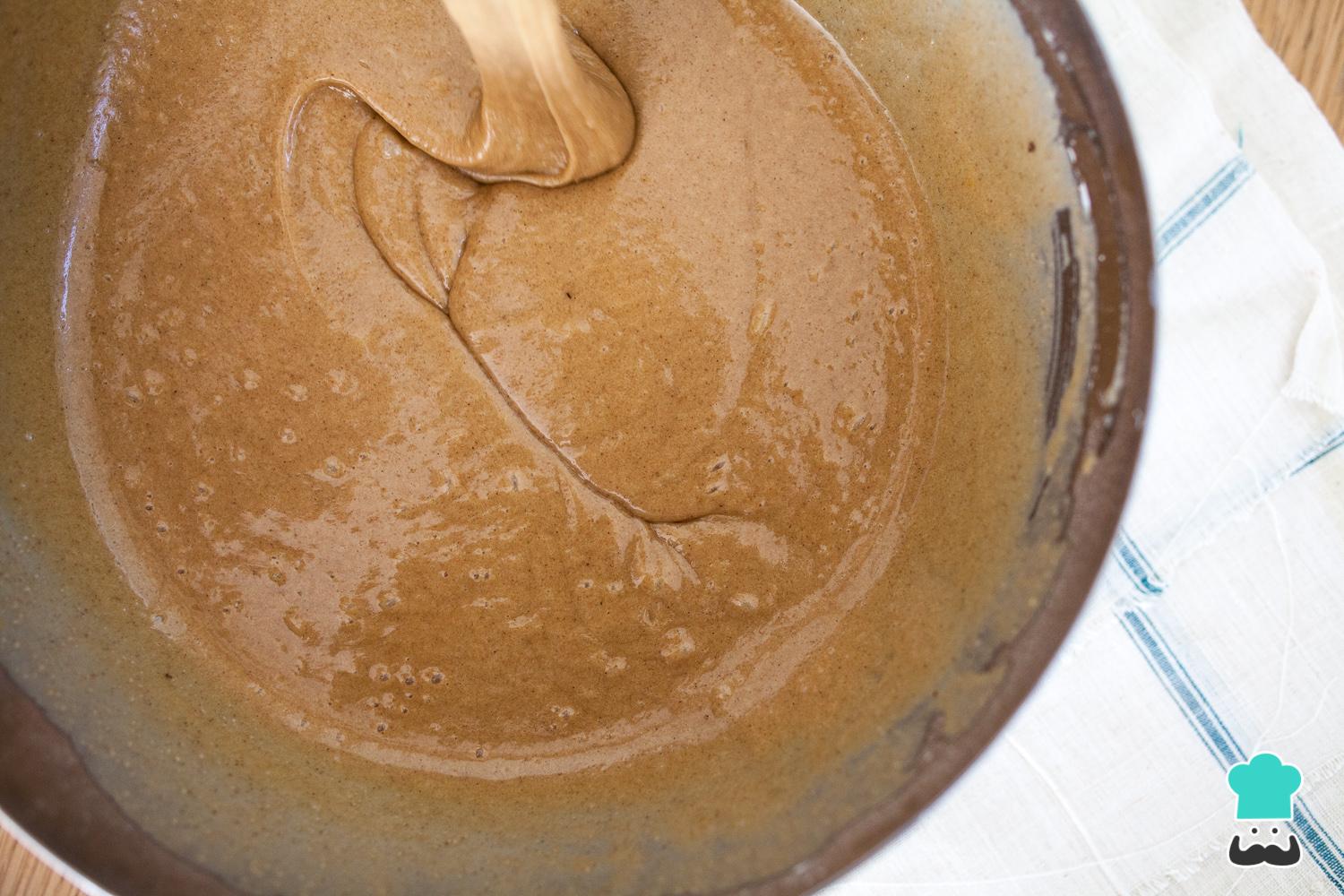 Após o passo anterior, adicione a farinha peneirada junto com a canela e o fermento, envolva na massa com uma colher, e bata novamente com a batedeira. O resultado deverá ser uma massa com todos os ingredientes bem misturados, e sem grumos.