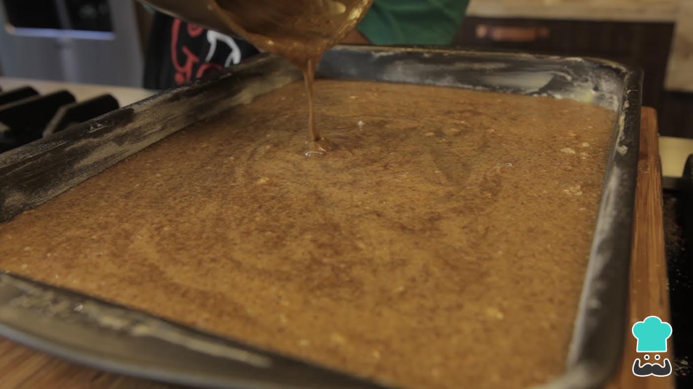 Coloque a massa em uma assadeira retangular ou quadrada já untada e enfarinhada, e alise. Leve a assar no forno preaquecido a 150ºC por 20 minutos, depois suba para 180ºC e deixe ficar até dourar.