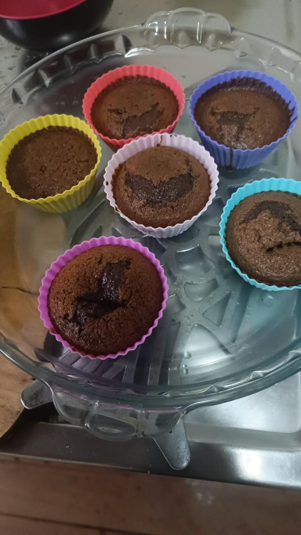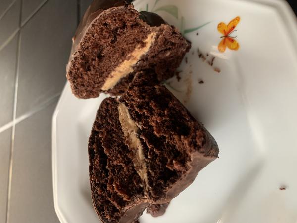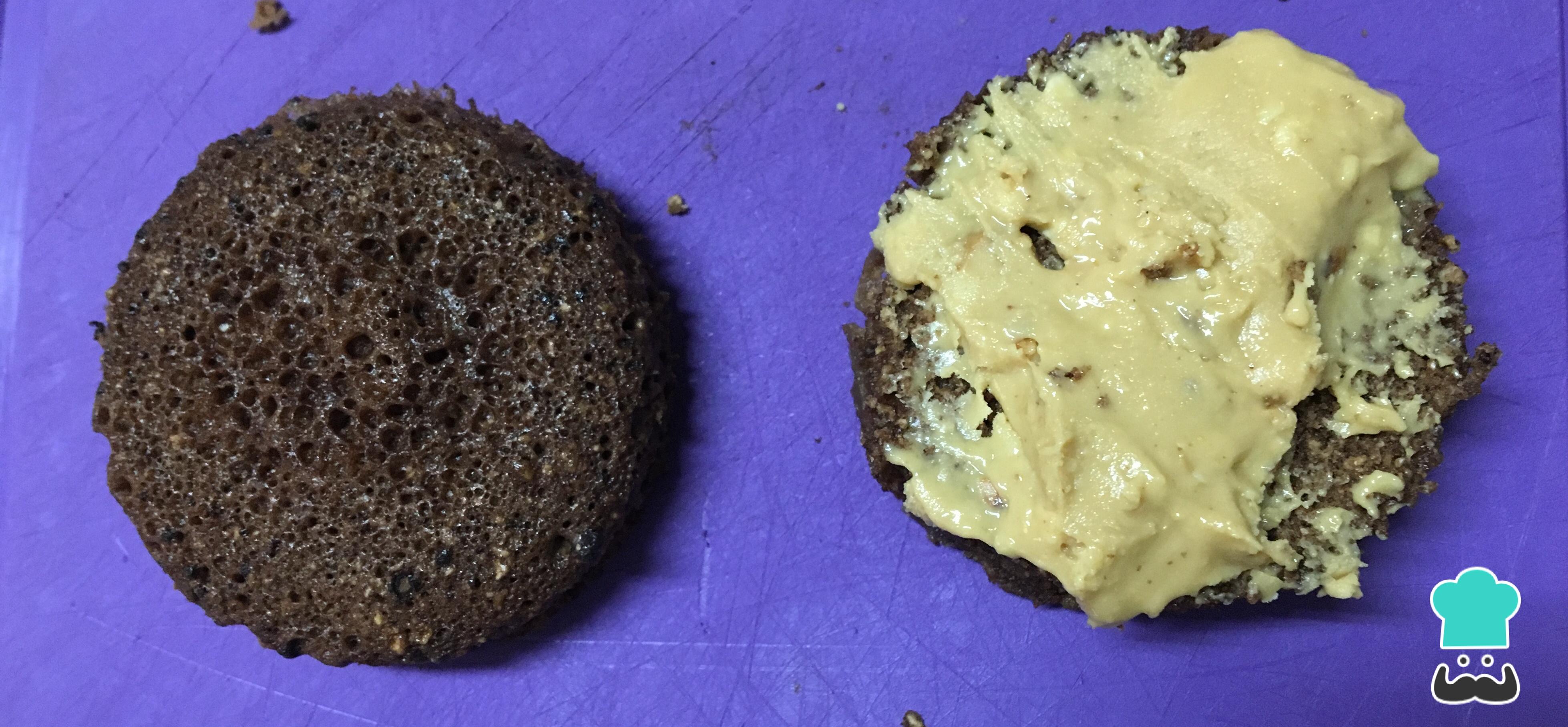 Retire e deixe esfriar. Depois corte os bolinhos ao meio e coloque a pasta de amendoim. Tampe e deixe no congelador por 20 minutos.