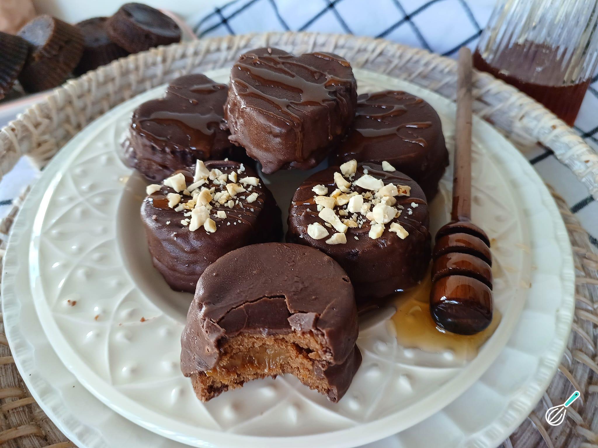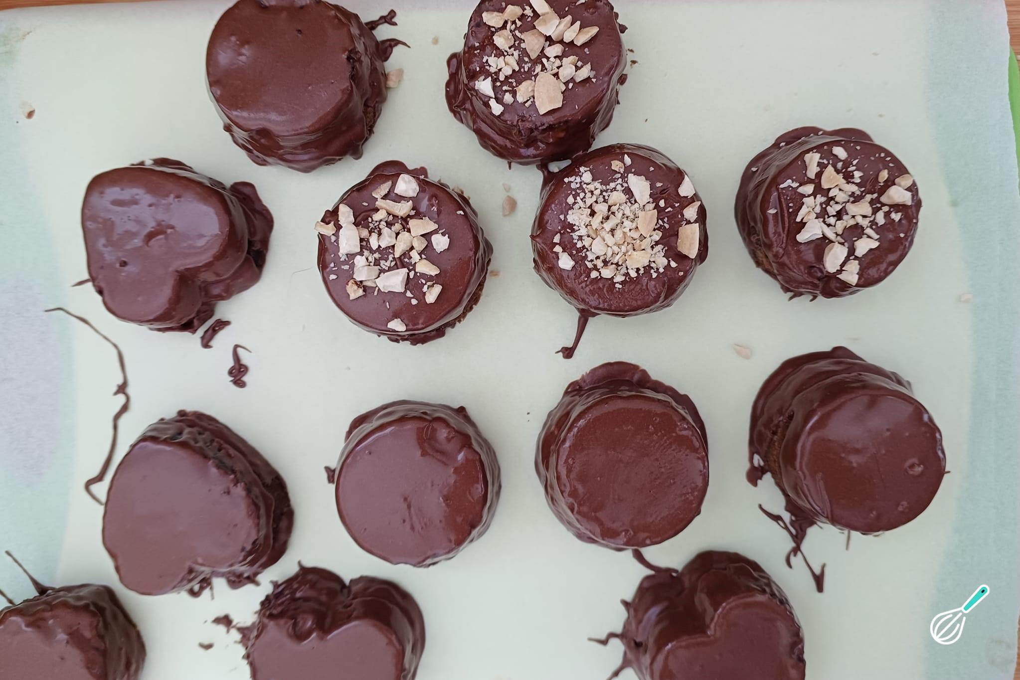 Com o chocolate fracionado derretido, usando 2 garfos, banhe cada pão de mel até que fique totalmente envolvido pelo chocolate.