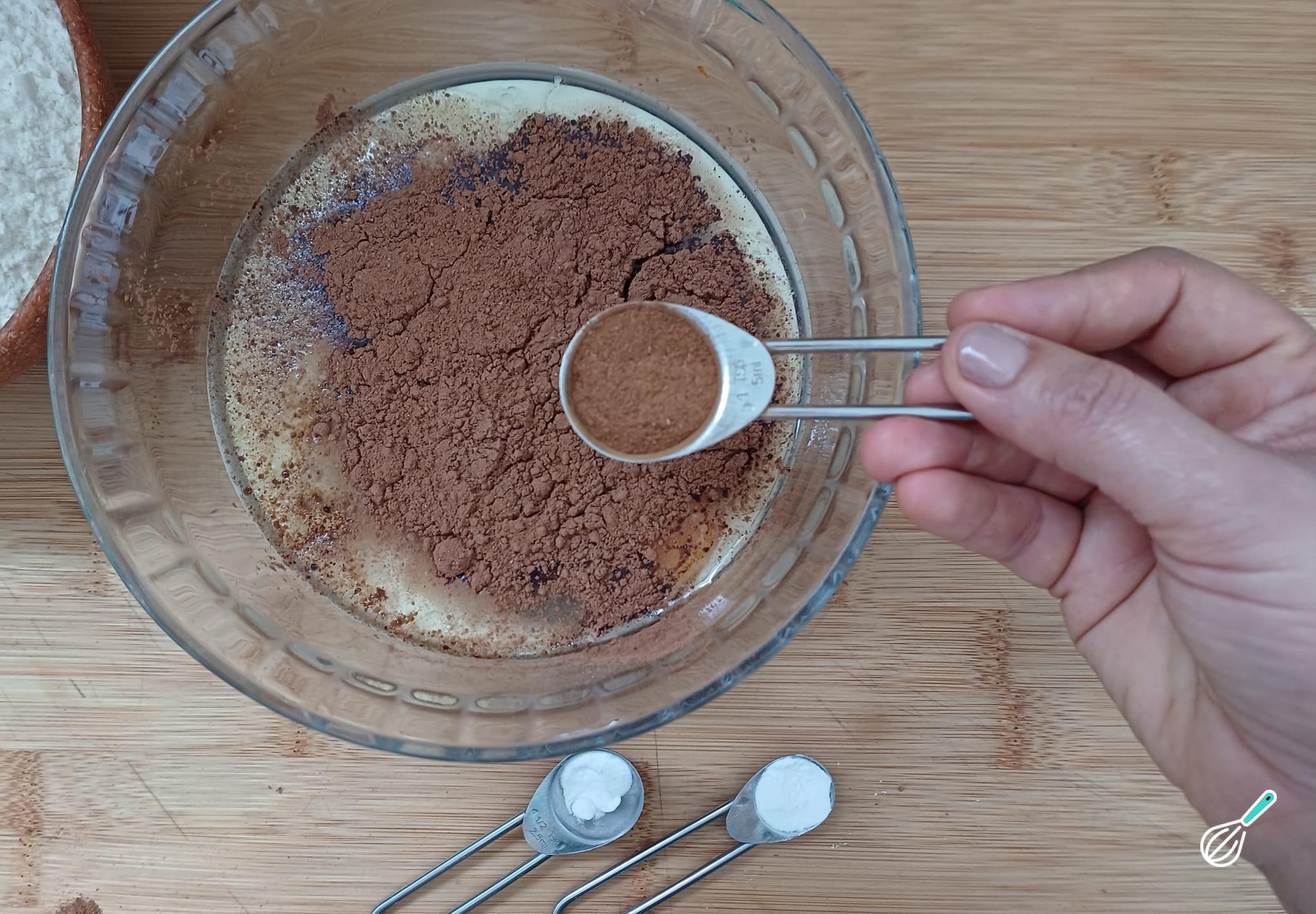 Em seguida, junte os ingredientes secos, começando pelo açúcar mascavo, chocolate em pó, canela em pó, bicarbonato de sódio e fermento químico, misturando bem.