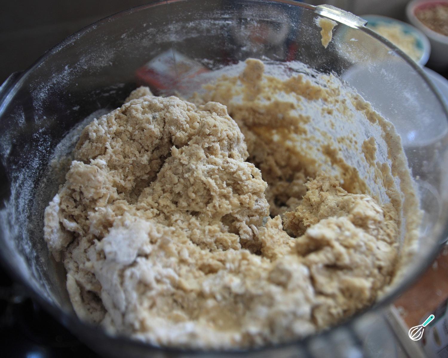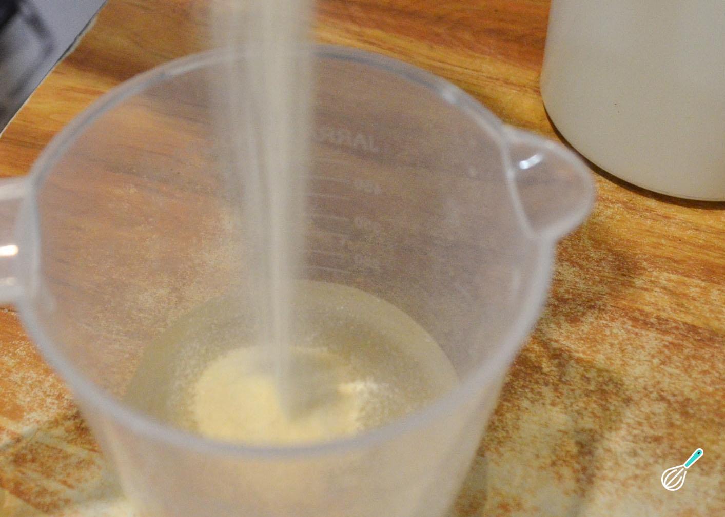 À parte misture a farinha de milho com o sal, o extrato de malte e o óleo ou azeite. Adicione a água quente, misture e reserve por 30 minutos.