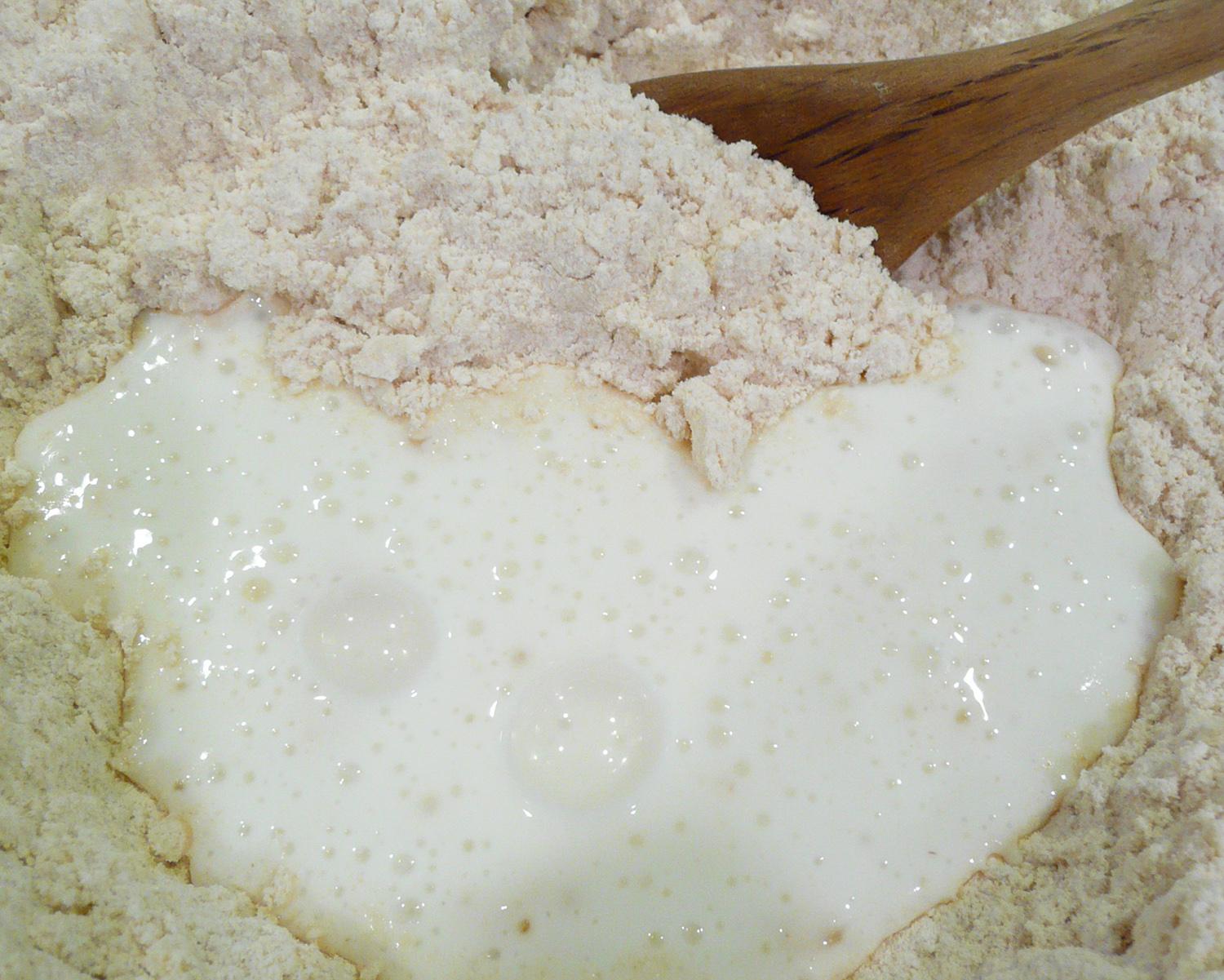 Misture os ingredientes enquanto adiciona o leite aos poucos. Poderá não ser necessário usar todo o leite ou usar um pouco mais que a quantidade indicada - antes de colocar mais leite amasse bem a massa para checar a consistência.