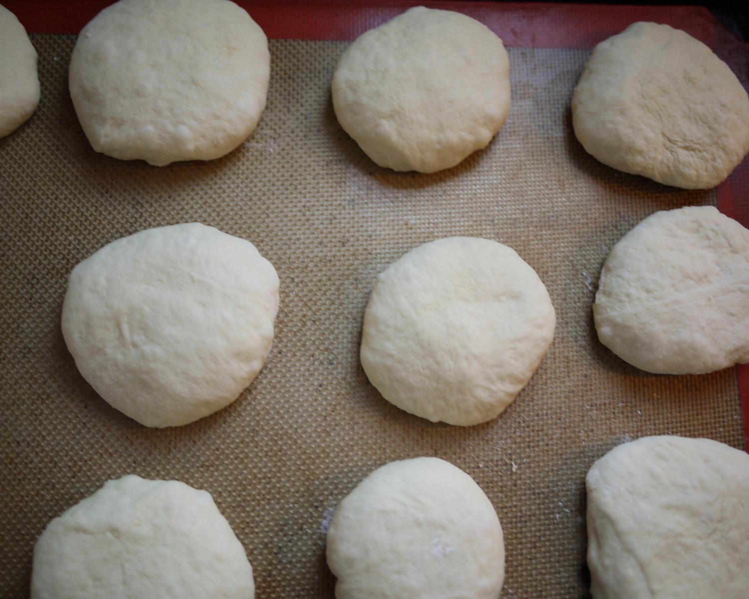 Transfira a massa de pãozinho simples para uma bancada enfarinhada e sove até ficar lisinha e desgrudando da mão e da bancada. Divida a massa em porções e modele bolinhas com mais ou menos o tamanho da palma da sua mão e coloque num tabuleiro de forno com papel manteiga ou com um tapete para assar.