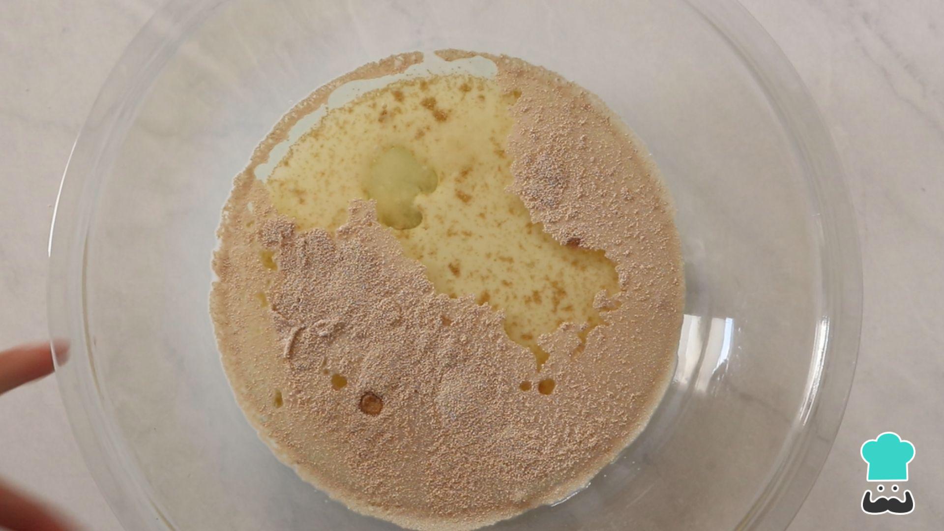 Em uma tigela grande coloque o leite morno, o fermento, o óleo, o sal e o açúcar e misture bem.