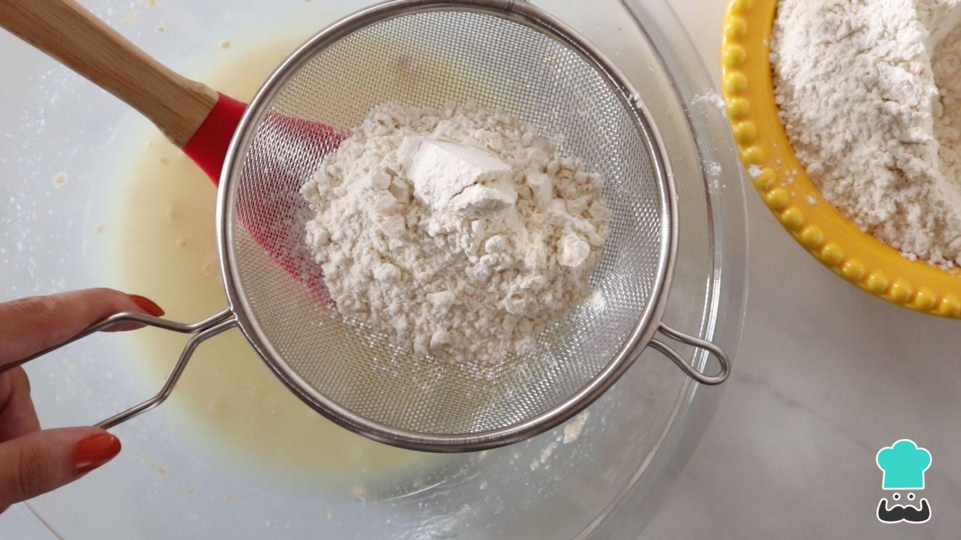 Em seguida, adicione a farinha de trigo aos poucos, passando por uma peneira pra evitar aqueles grumos na massa.
