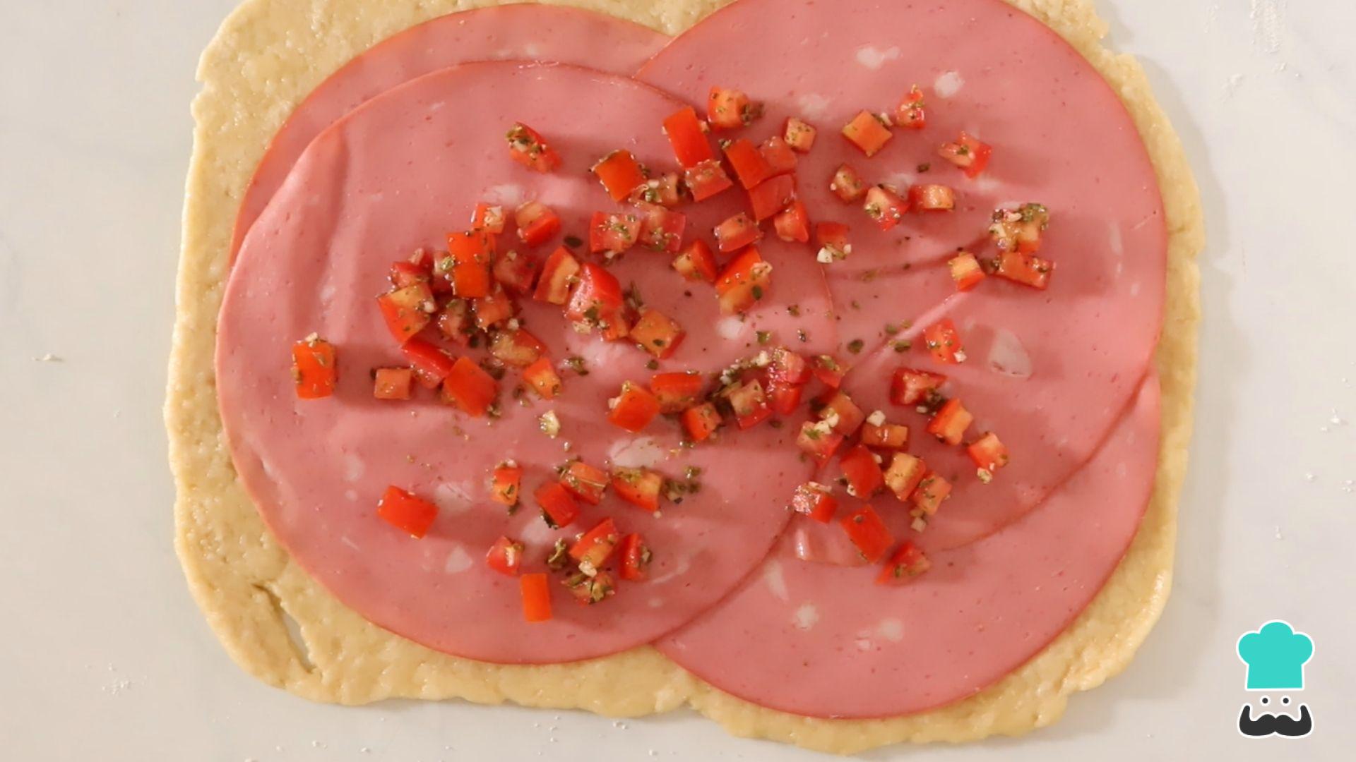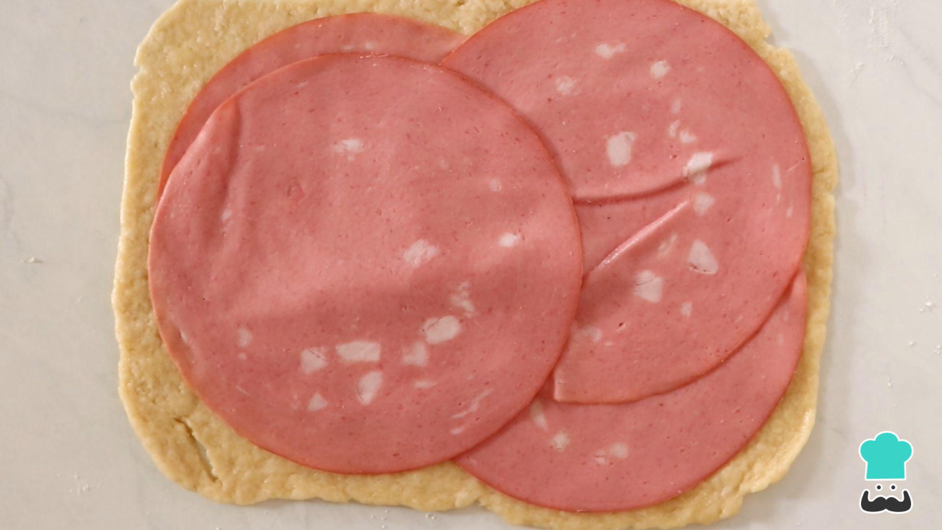 Tudo pronto? Abra a massa com ajuda de um rolo e no tamanho que você quiser. Coloque as fatias de mortadela.