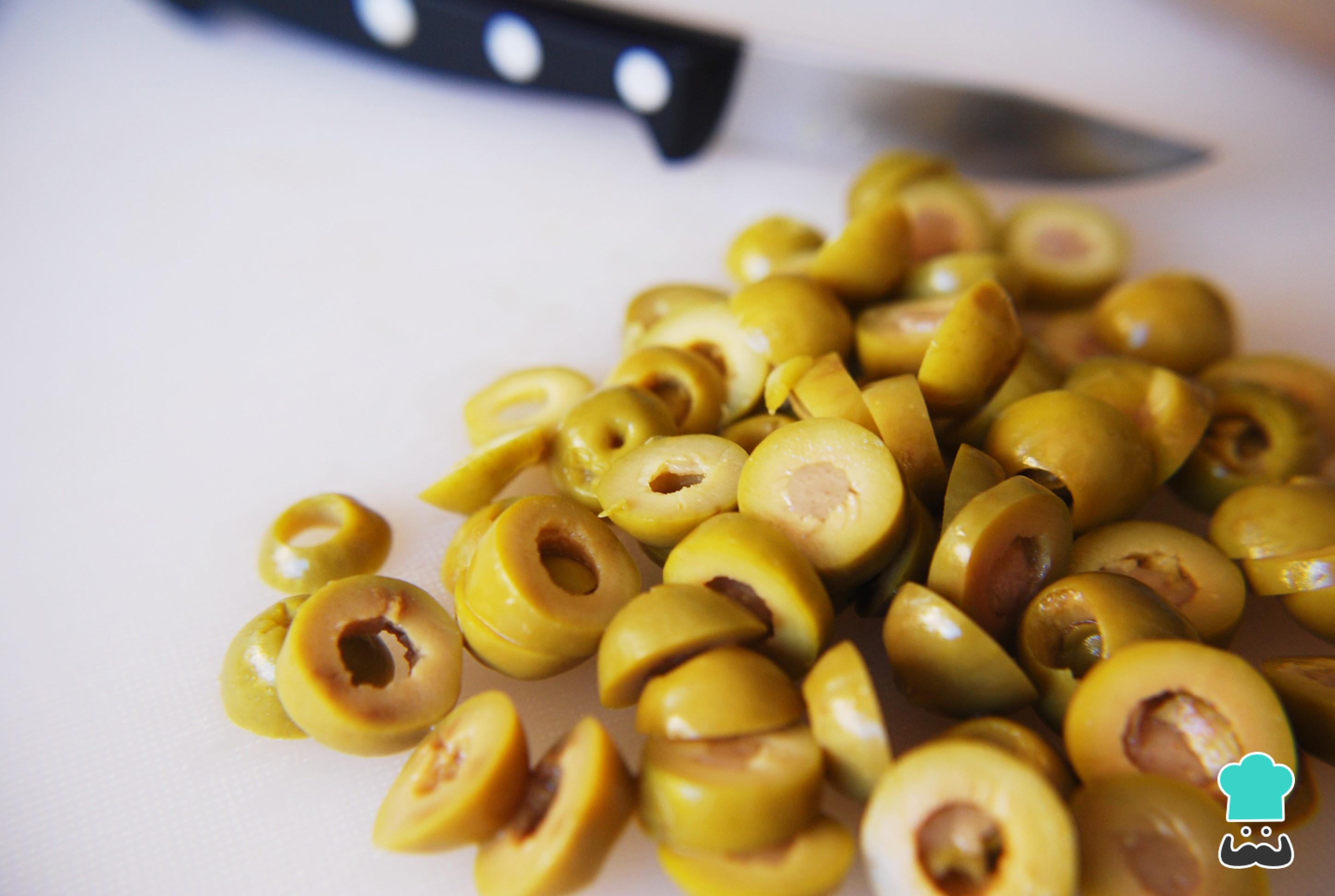 Corte o bacon e as azeitonas em pedaços, caso não encontre esse formado à venda nas lojas.