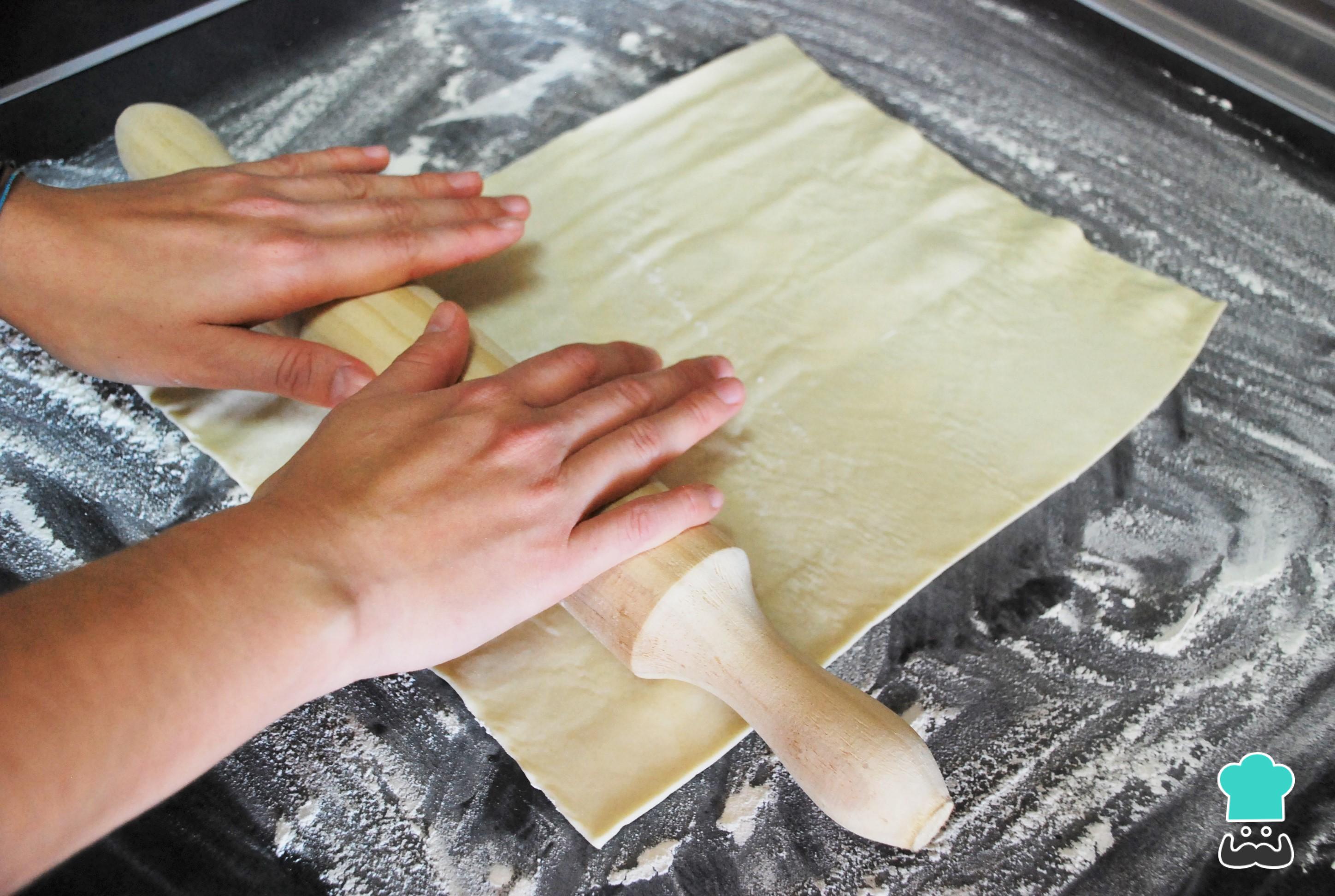 Abra a massa nessa superfície e estique-a com um rolo, de forma a que fique mais fina, porém sem rasgar.