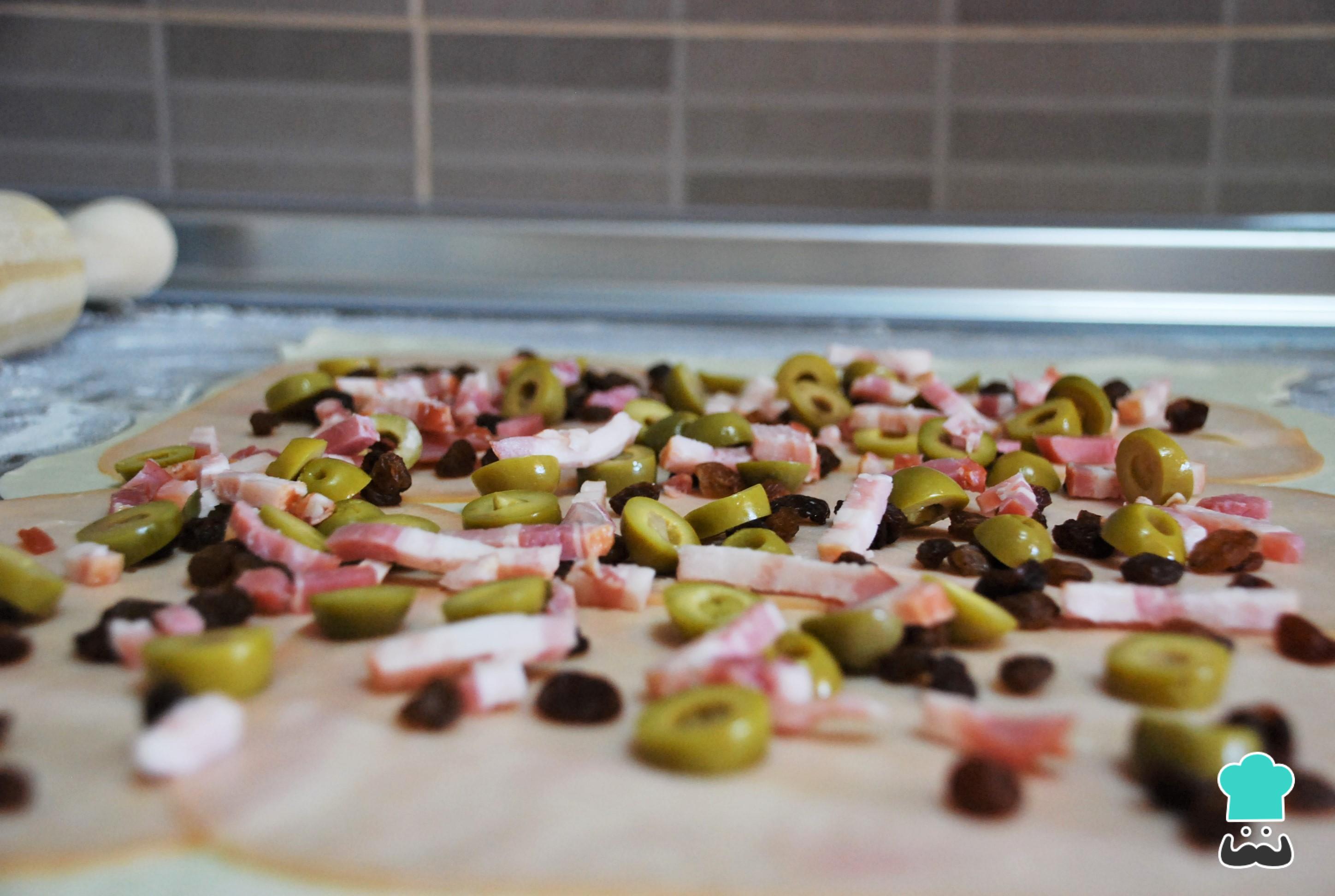 O próximo passo é colocar o recheio. Primeiro cubra a massa com uma camada uniforme de presunto defumado e, em seguidas polvilhe os restantes ingredientes em toda a área.