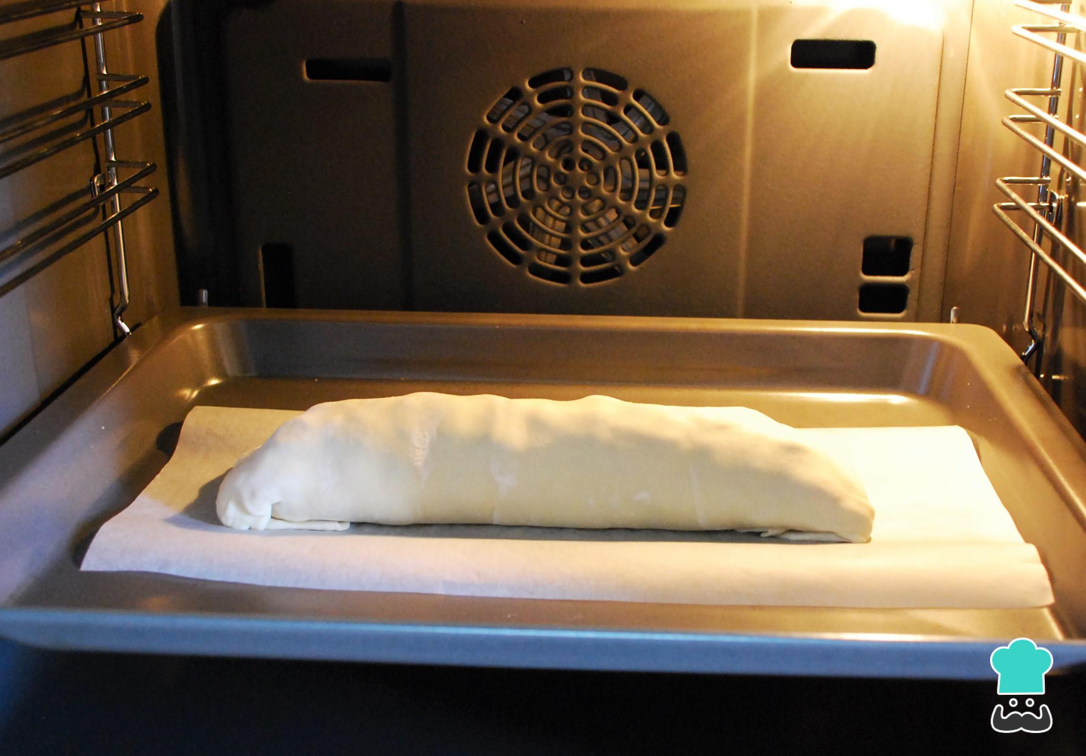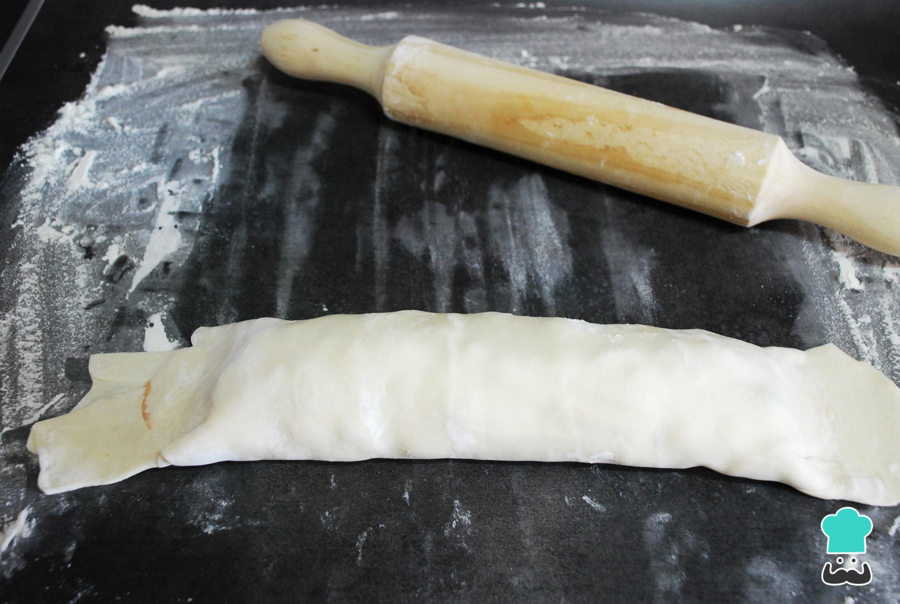 Seguidamente enrole a massa como se fosse um rocambole. Estique as pontas com a ajuda do rolo da massa, e dobre para baixo.