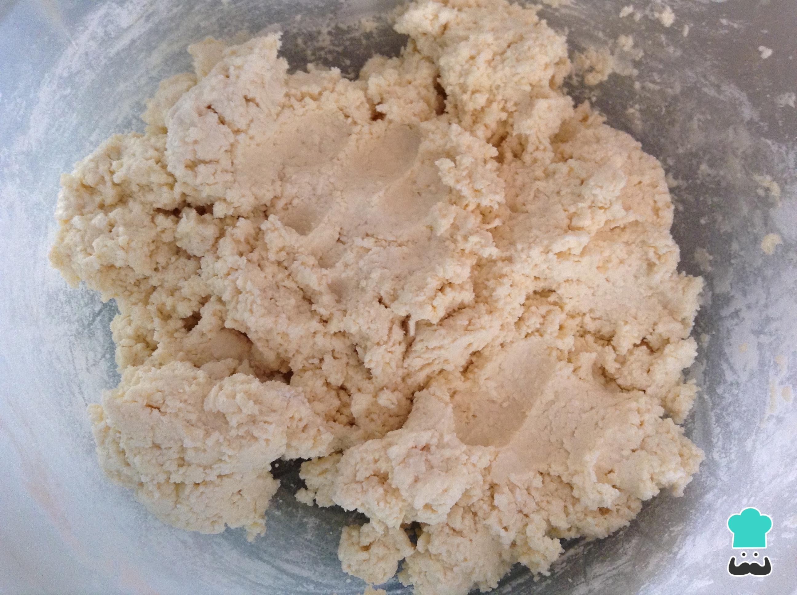 Adicione o bicarbonato de sódio e a água, pouco a pouco. O ideal é que a massa um pouco seca, como na fotografia abaixo, por isso poderá não ser necessário usar toda a água.