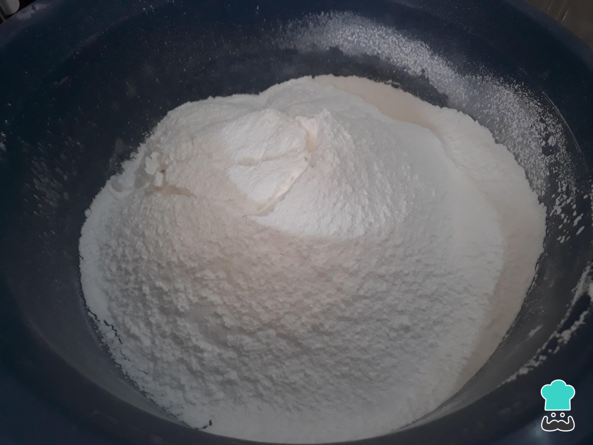 Primeiramente peneire os dois tipos de polvilho em uma vasilha para evitar os grumos.