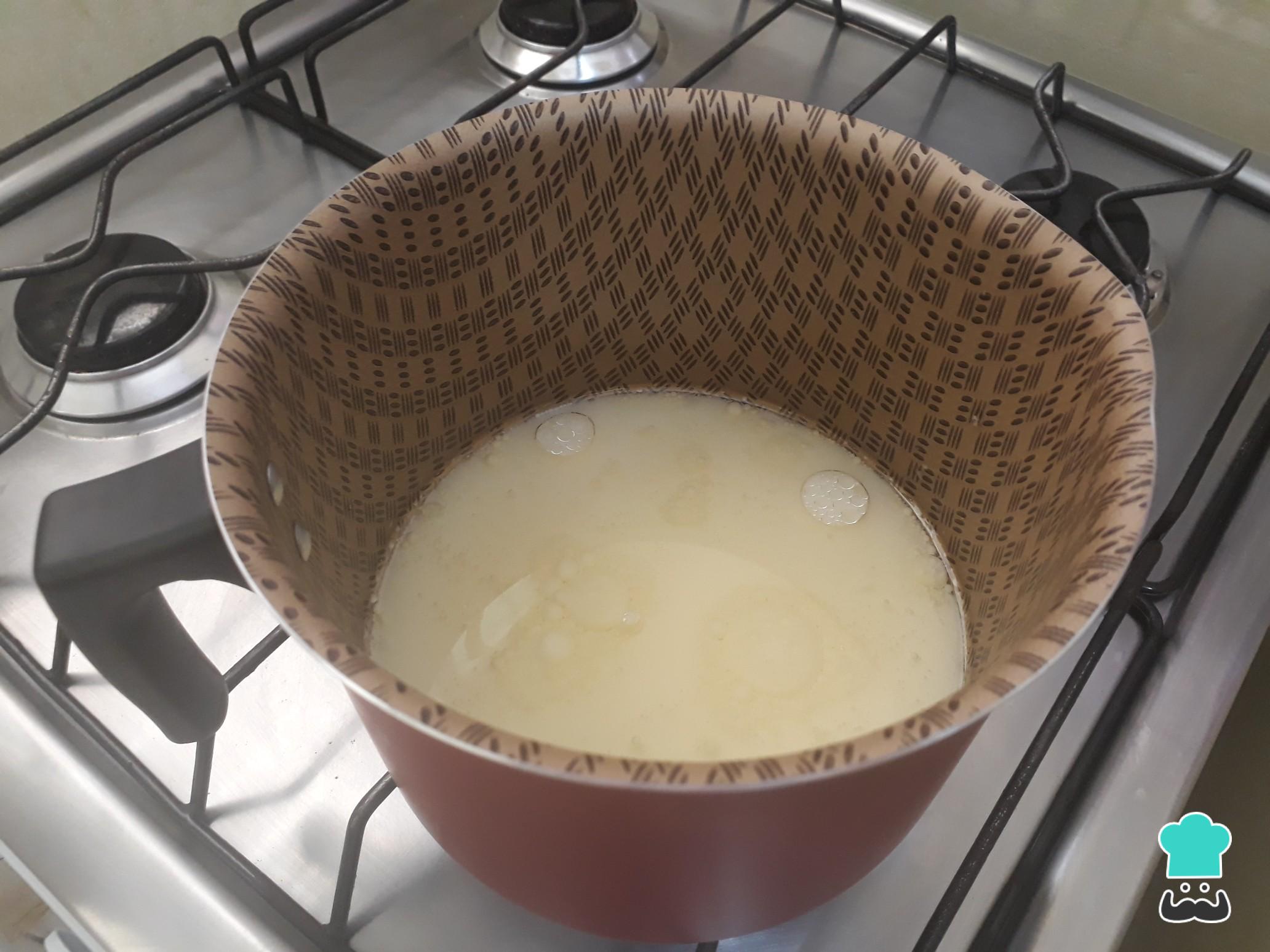 Em uma panela ferva o leite, o óleo, a água e o sal. Desligue assim que levantar fervura, pois a mistura poderá transbordar.