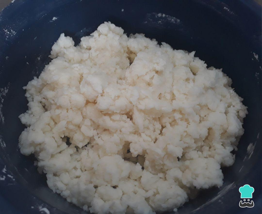 Adicione no polvilho escaldado e já frio o ovo e o queijo ralado. Sove por 5 minutos até formar uma massa consistente e uniforme, como na foto.