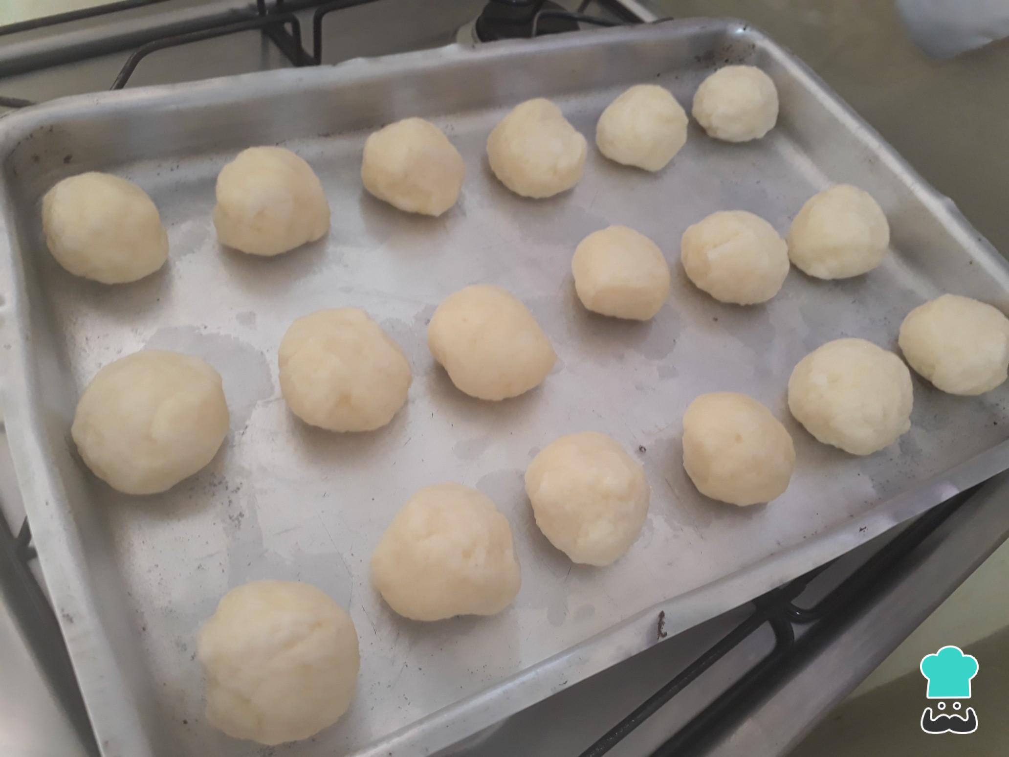 Divida a massa, faça bolinhas do tamanho que preferir e coloque num tabuleiro de forno. Asse no forno pré-aquecido em temperatura alta por 30 minutos.