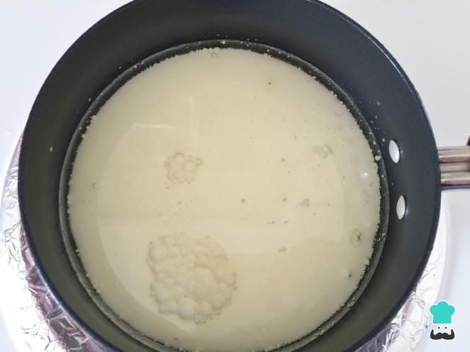 Para fazer esse pão de queijo com polvilho doce, comece por aquecer o óleo, o leite, a água e o sal em uma panela a fogo médio. Coloque o polvilho em uma tigela e cubra com a mistura anterior. Mexa com uma colher e deixe esfriar.