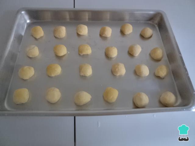 Junte os ovos (um a um) e vá misturando. Junte o queijo e misture bem a massa. Enrole o pão de queijo com polvilho doce e leve a uma forma média untada com um fio de óleo. Asse em forno médio preaquecido até os pãezinhos ficarem levemente dourados (cerca de 20 minutos).