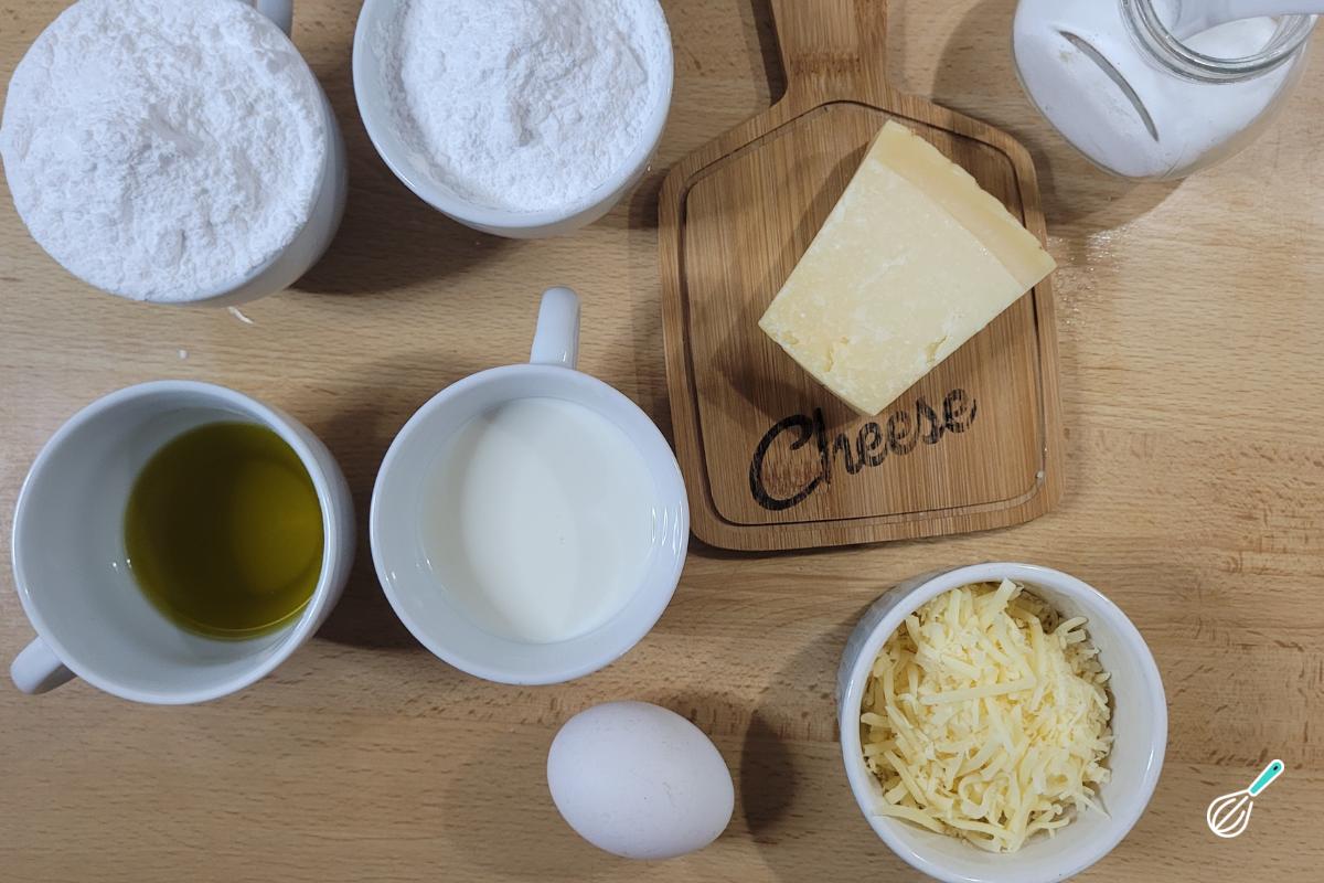 Separe os ingredientes para fazer seu pão de queijo. Você pode mudar a proporção de polvilho doce e polvilho azedo conforme a sua preferência de textura - a propoção de usamos aqui foi para criar um balanço de puxa puxa e crocância.