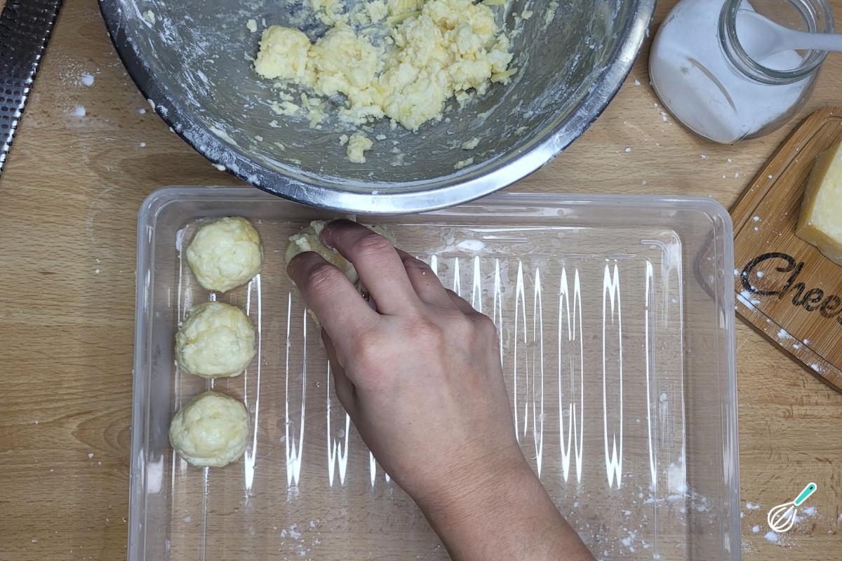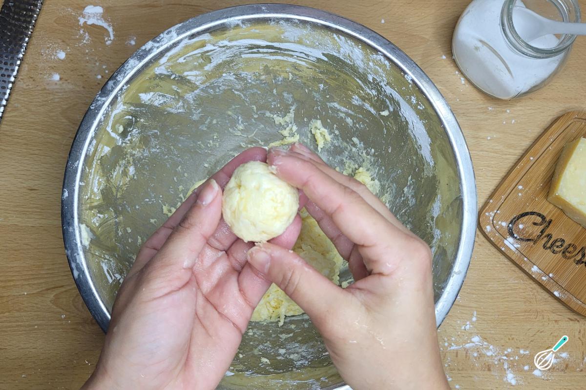 Pegue porções da massa e faça bolinhas do tamanho que preferir - lembrando que os pães de queijo crescem bastante no forno pela expansão do polvilho. É normal que a massa fique mais grudenta, mas ao formar as bolinhas, elas precisam ter estrutura.