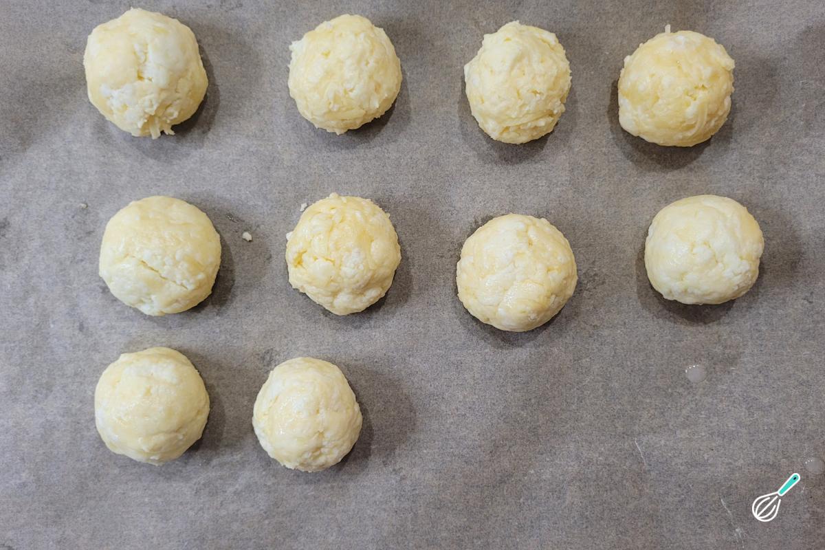 Disponha as bolinhas em uma assadeira untada ou com papel manteiga, deixando um espaço entre elas, pois os pães de queijo crescem no forno.