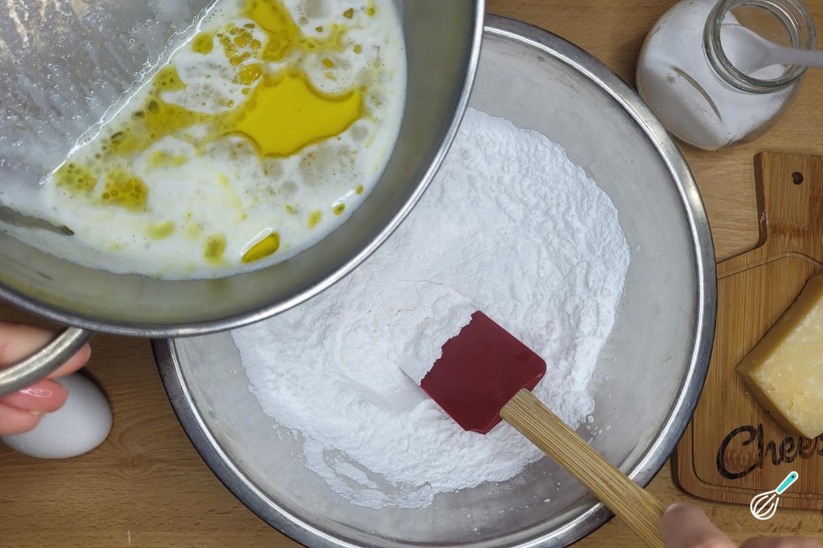 Jogue a mistura fervendo sobre a mistura de polvilhos com cuidado e aos poucos e vá mexendo com uma espátula.
