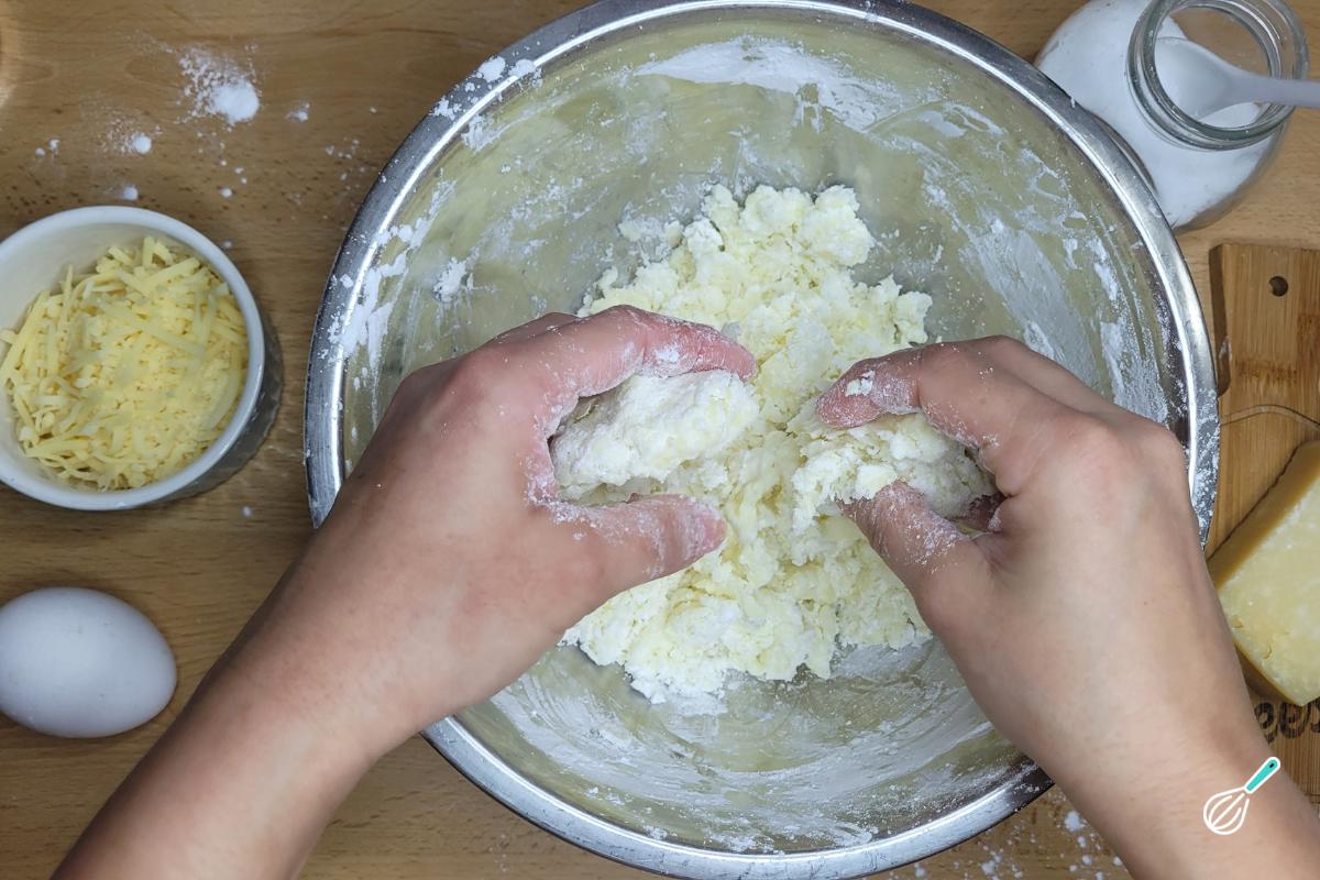 Se estiver muito quente, o ovo pode coagular e o queijo derrete, desandando a massa. Para saber se a massa esfriou o suficiente, basta que você consiga trabalhar a massa de forma confortável, sem se queimar.
