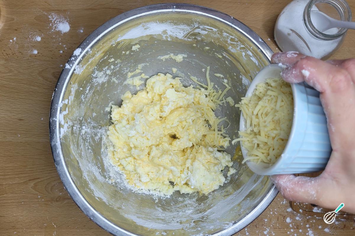 Adicione o ovo, misture e adicione o queijo meia cura ralado.