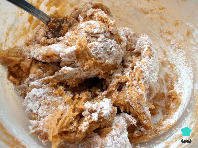 Depois de assar, em um recipiente misture a batata doce com a tapioca e o queijo minas ralado até que a massa fique homogênea e não grude na mão.