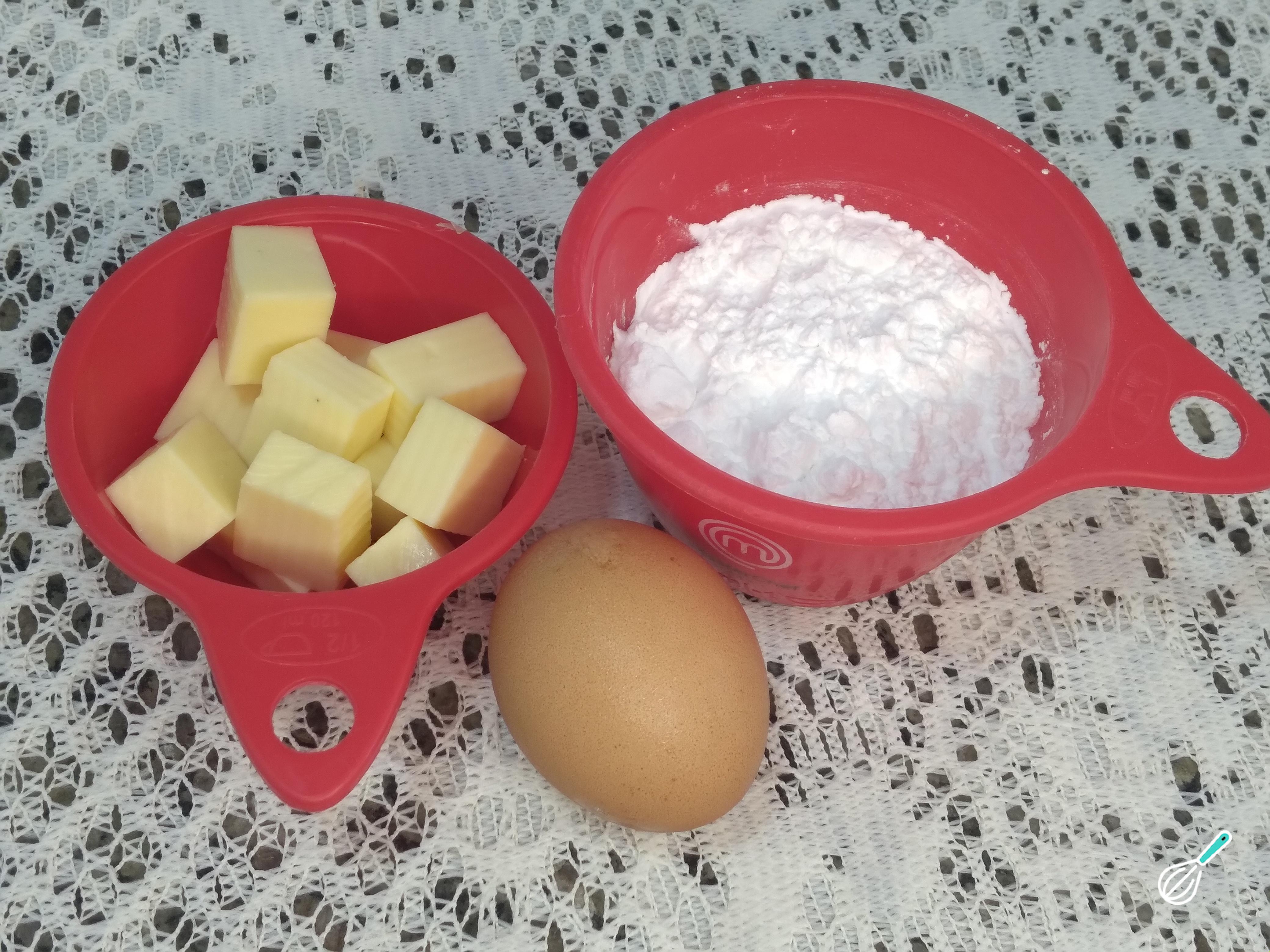 Comece separando os ingredientes. Corte o queijo muçarela em pedaços para facilitar passar no ralador e separe o polvilho doce.