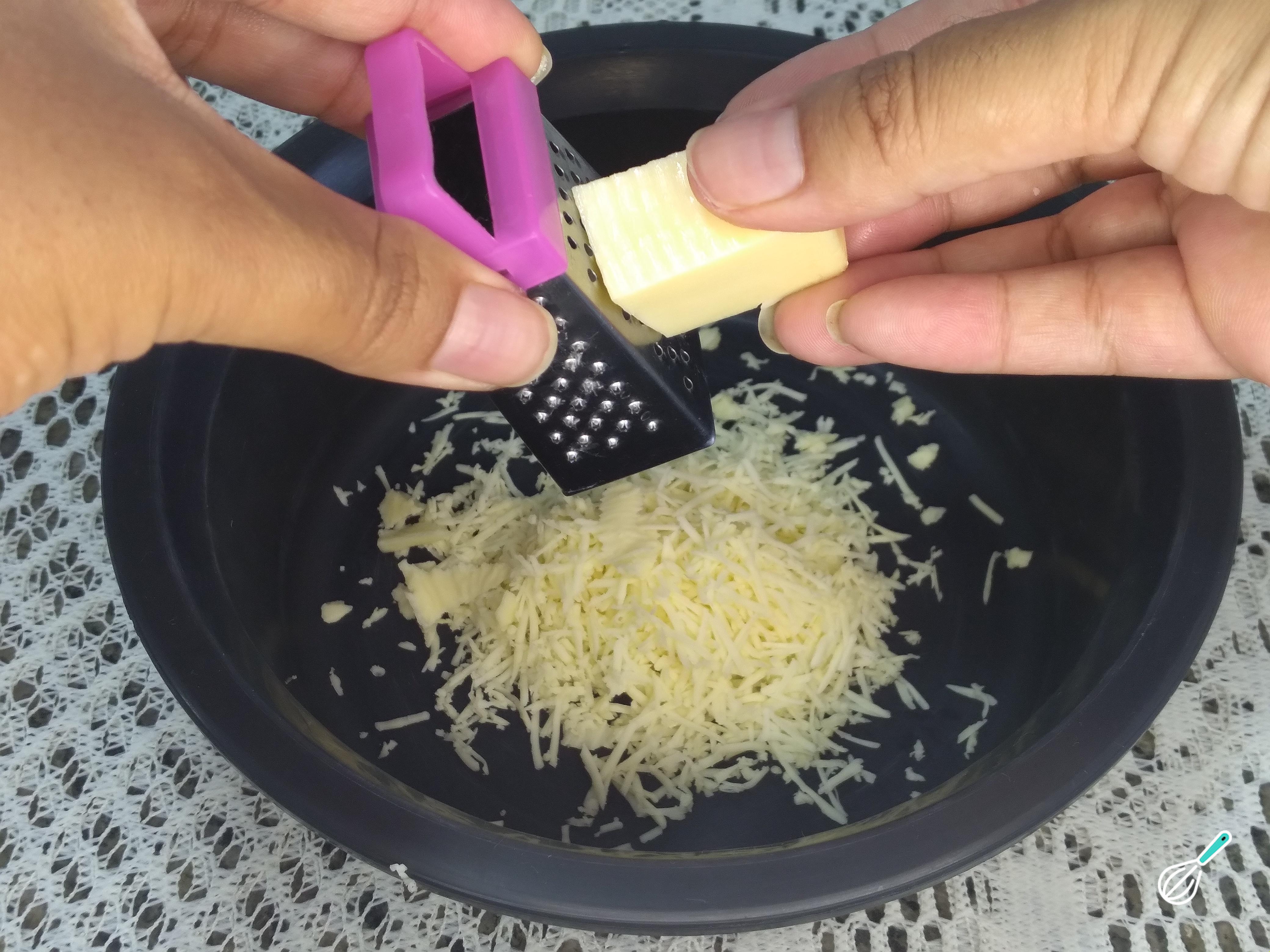 Usando o lado mais grosso do ralador, rale o queijo mussarela. Dessa forma ficará mais fácil e rápida a absorção do queijo na receita. Prefira queijos que derretam com facilidade, como o queijo mussarela ou o queijo prato.