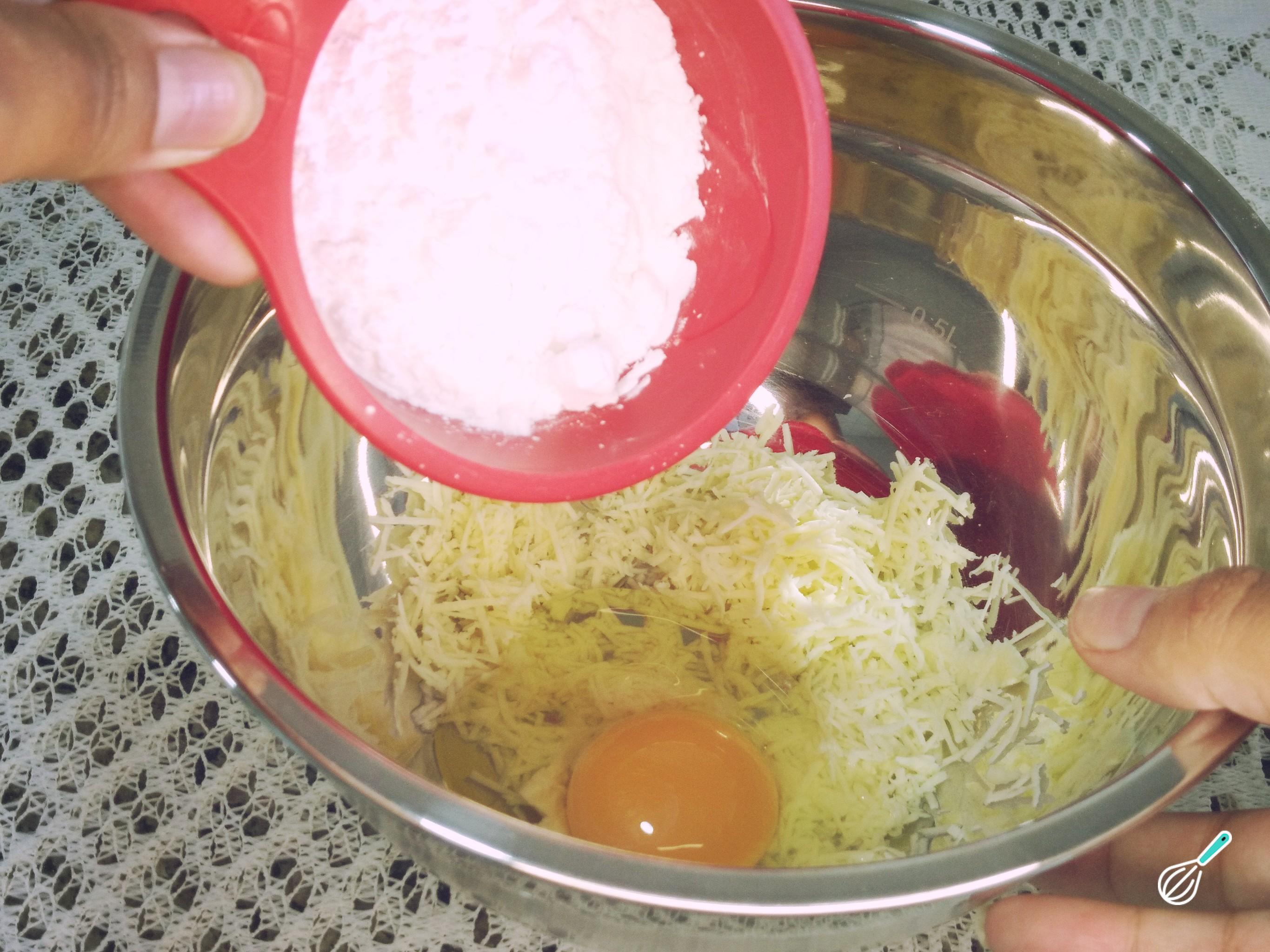 Em uma tigela, acrescente o ovo, o polvilho doce e o queijo mussarela já ralado. Acerte o sal. Misture tudo muito bem.