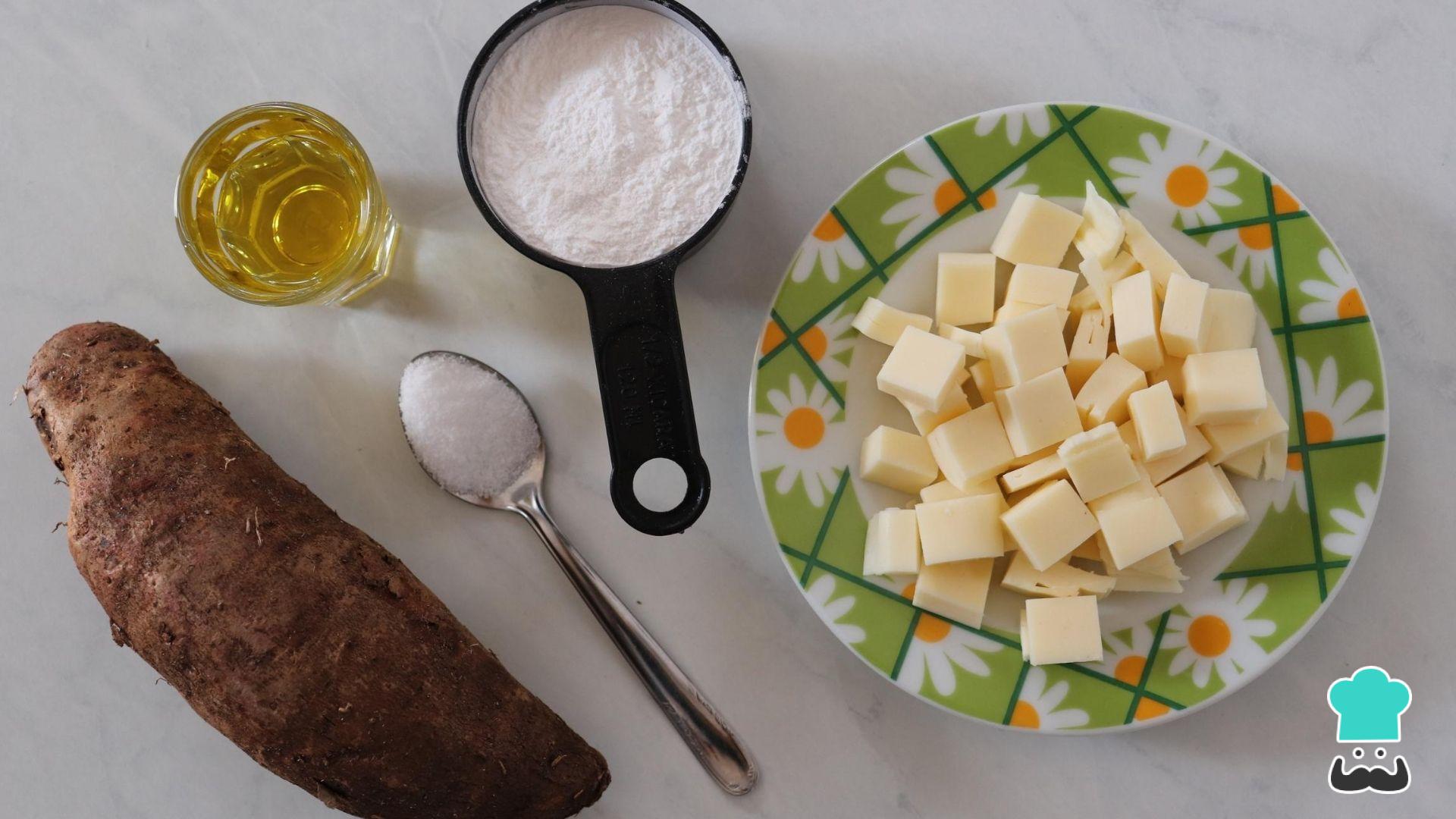 Separe os ingredientes que, acredite, são apenas esses: inhame, azeite, polvilho azedo, queijo e sal. Aqui nós usamos a muçarela mas você pode também optar pelo parmesão, queijo minas ou outro tipo que você tiver na sua casa.
