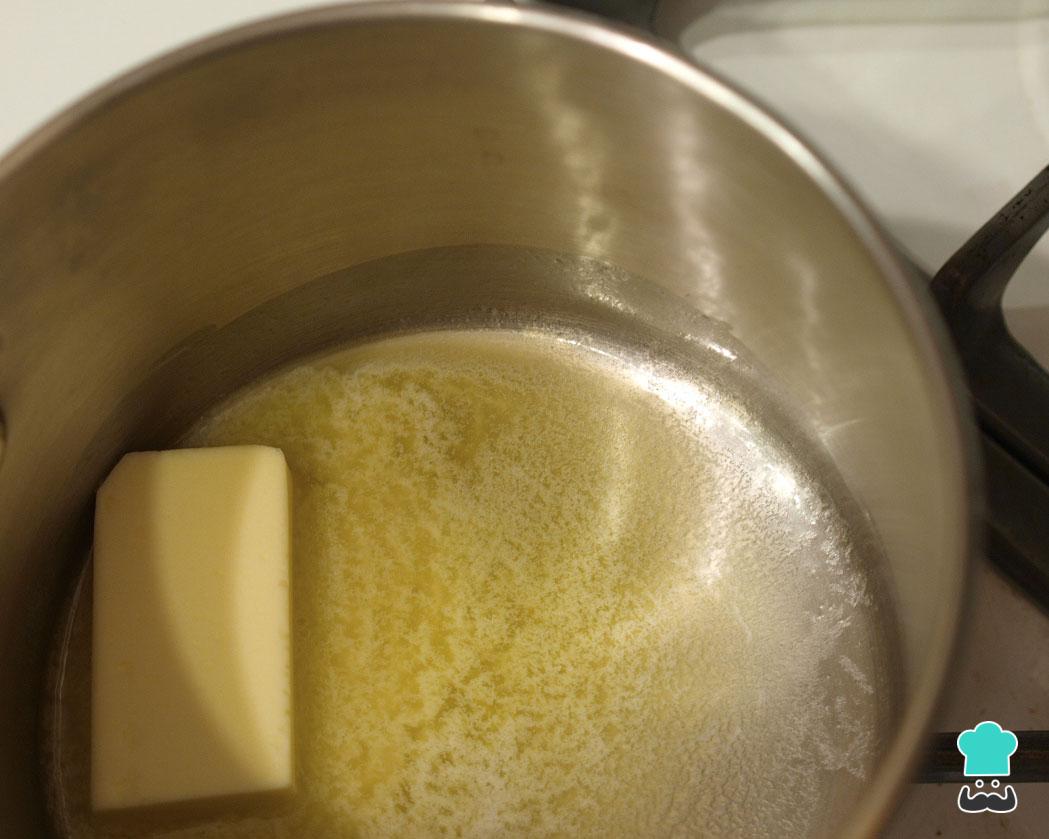 Leve ao fogo uma panela com a água e a manteiga e deixe até a manteiga derreter completamente.