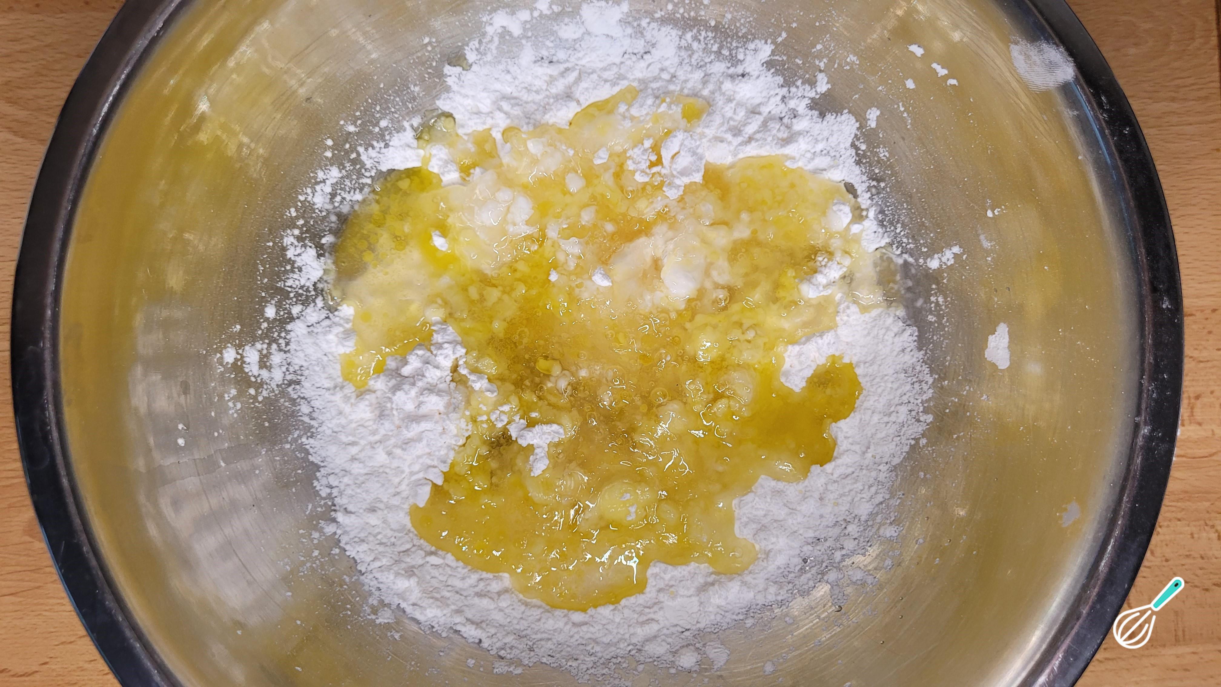 Em uma tigela, misture o polvilho doce, o azedo e o sal. Quando a mistura de óleo e água ferver, verta sobre a mistura de polvilhos para escaldar. Mexa bem com uma espátula.
