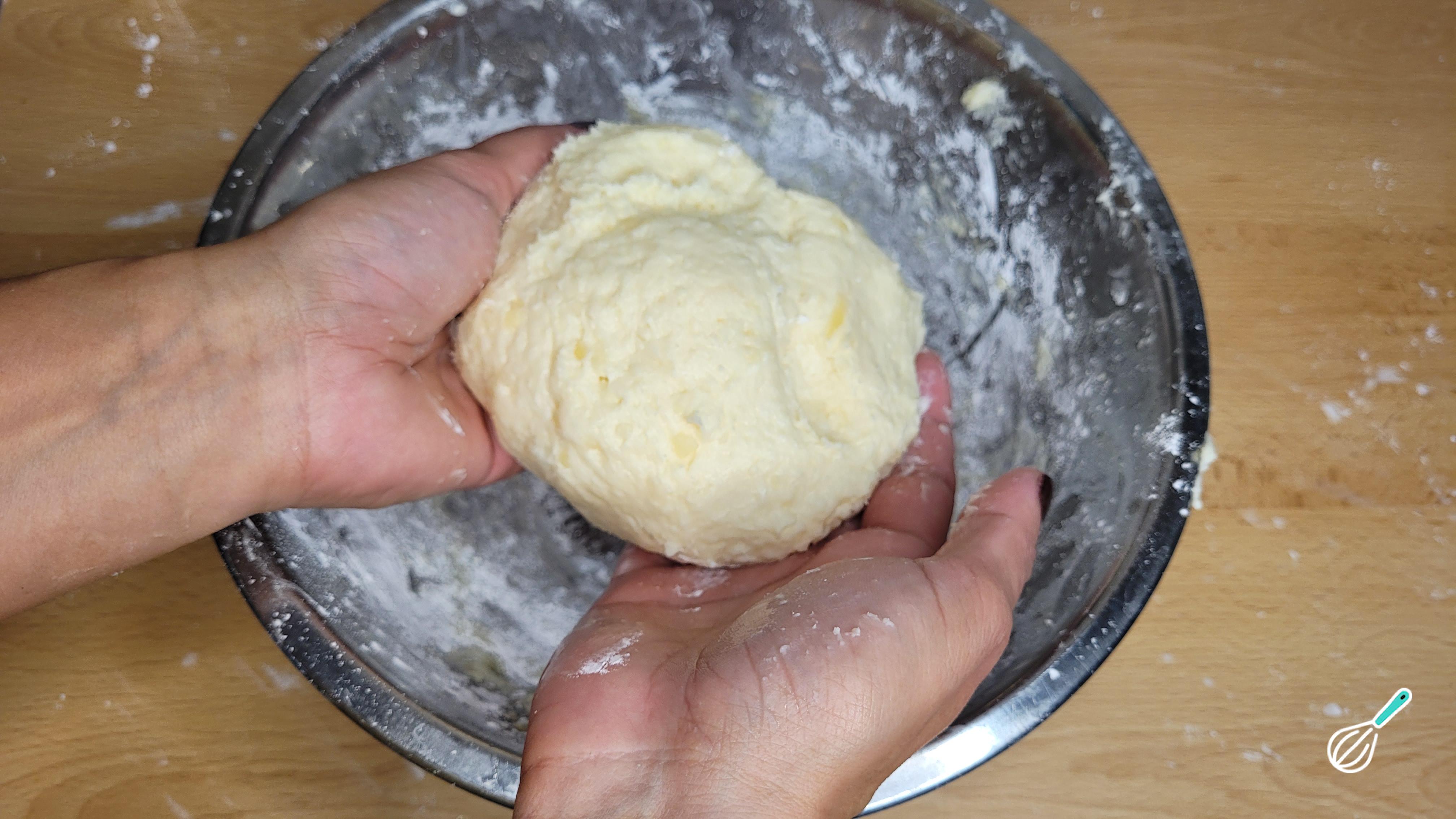 Espere esfriar um pouco, até conseguir colocar as mãos sem se queimar. Adicione o ovo, o queijo e o requeijão e misture bem com as mãos, até ter uma massa firme. A massa precisa ficar firme para formar as bolinhas e para que ela não derreta e afunde quando colocada na frigideira. Se estiver muito mole, pode colocar um pouquinho mais de polvilho doce aos poucos.