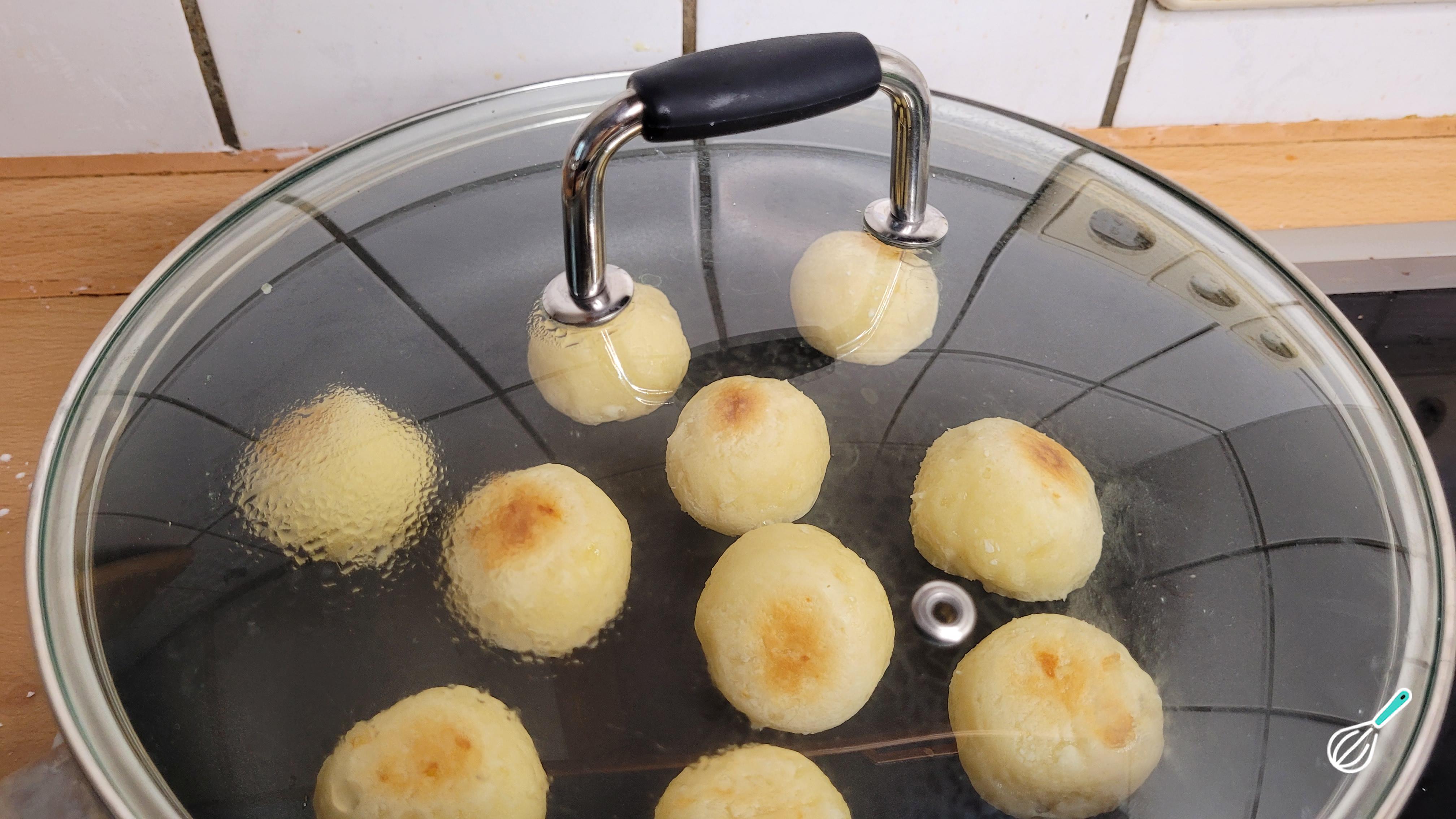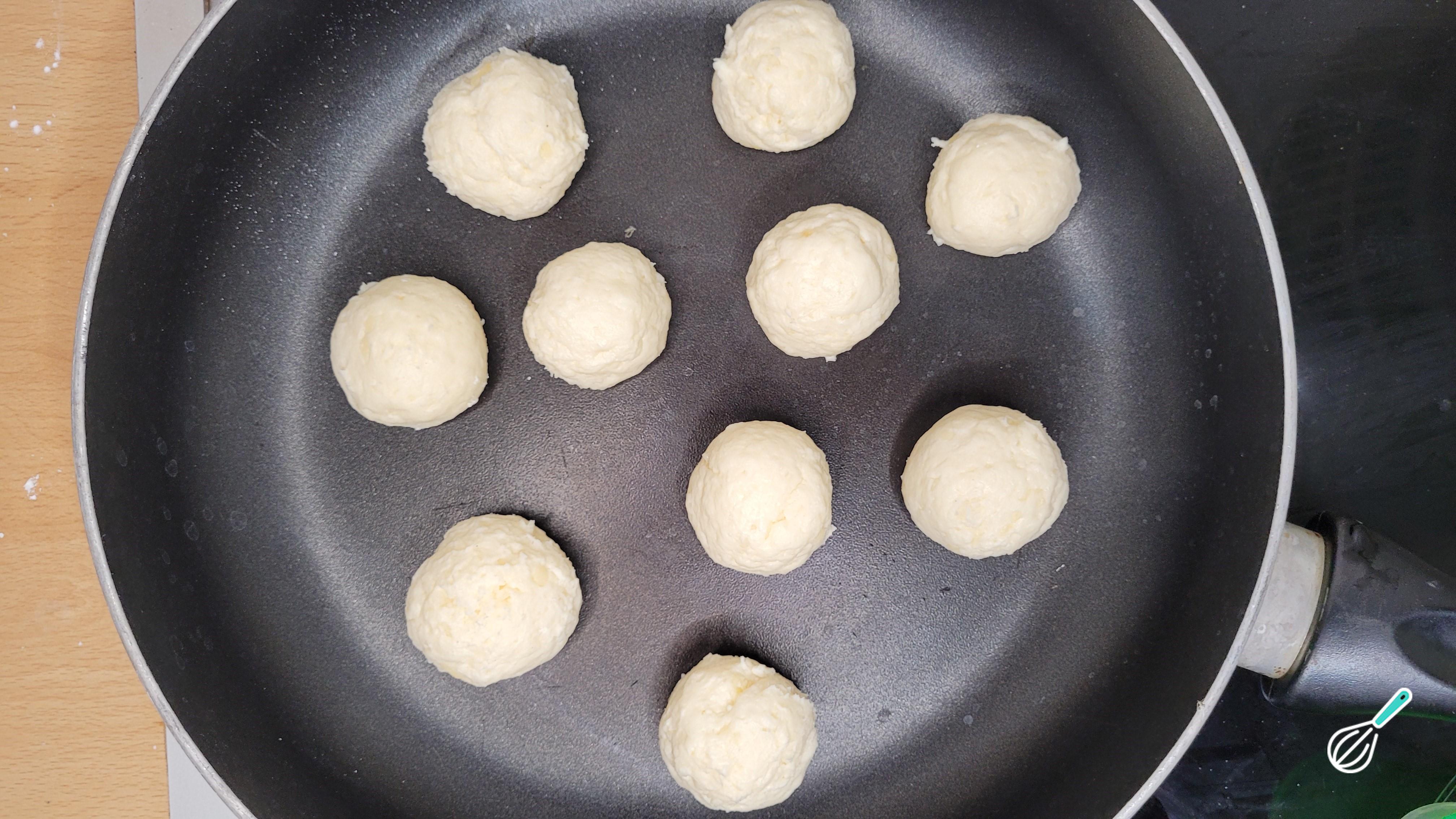 Vá pegando partes da massa e formando bolinhas. Disponha as bolinhas em uma frigideira grande de preferência antiaderente deixando um espaço entre elas.