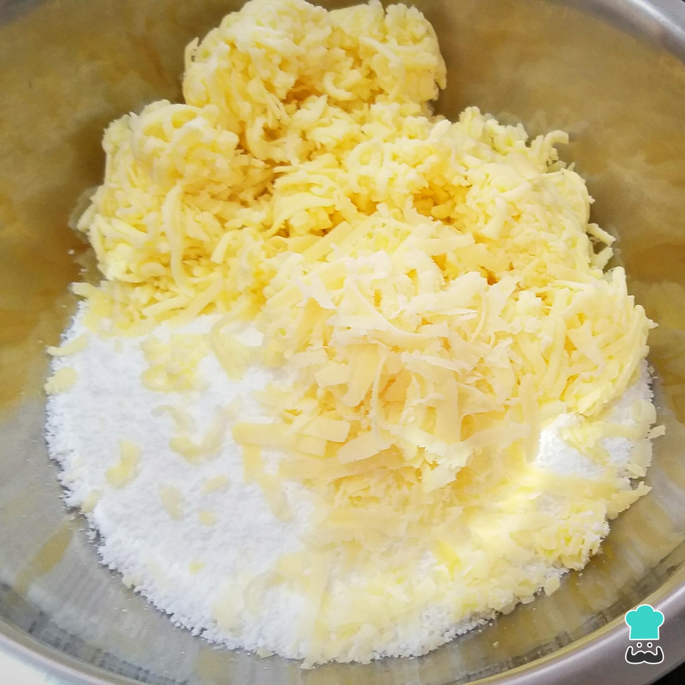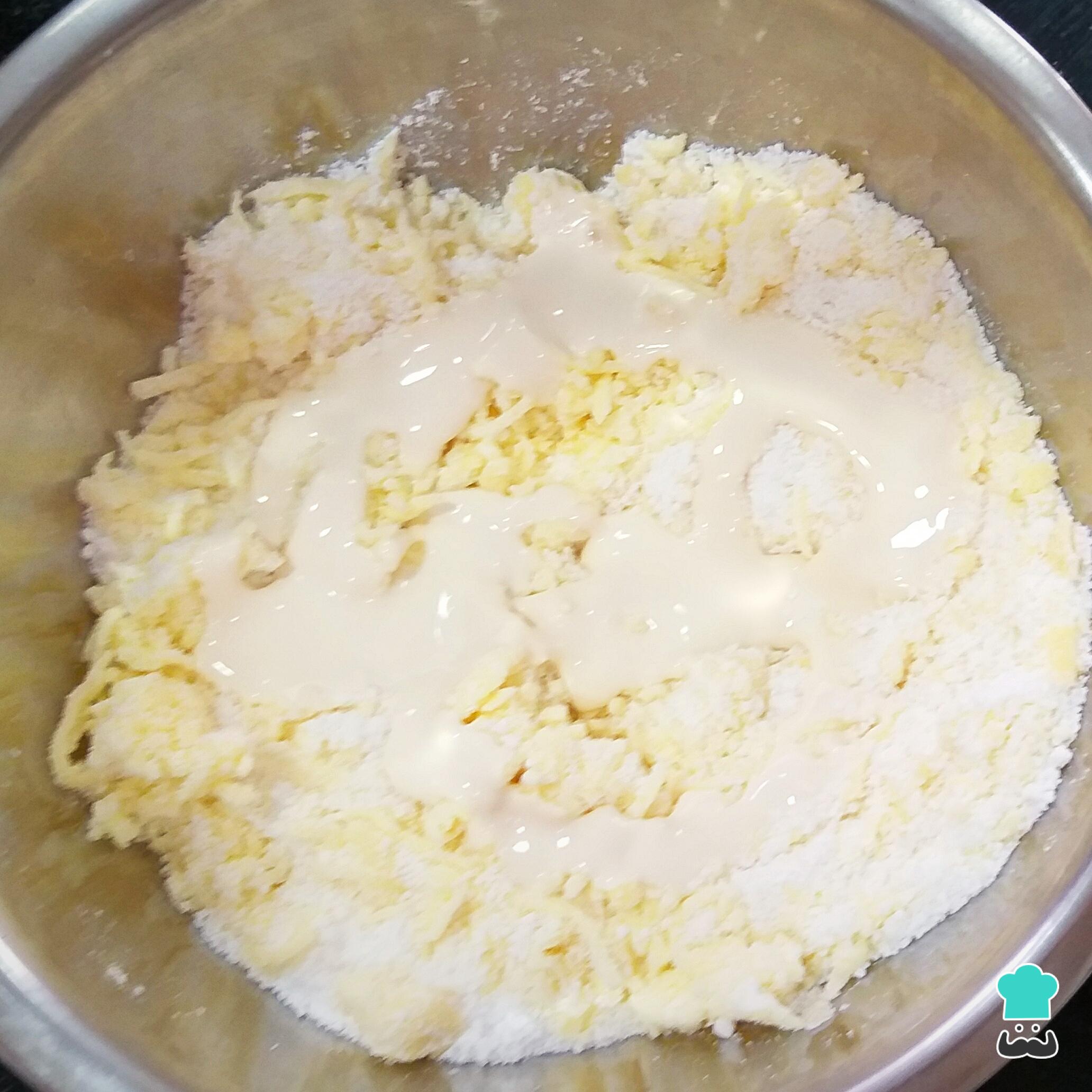 Em uma vasilha misture a goma de tapioca e os queijos.