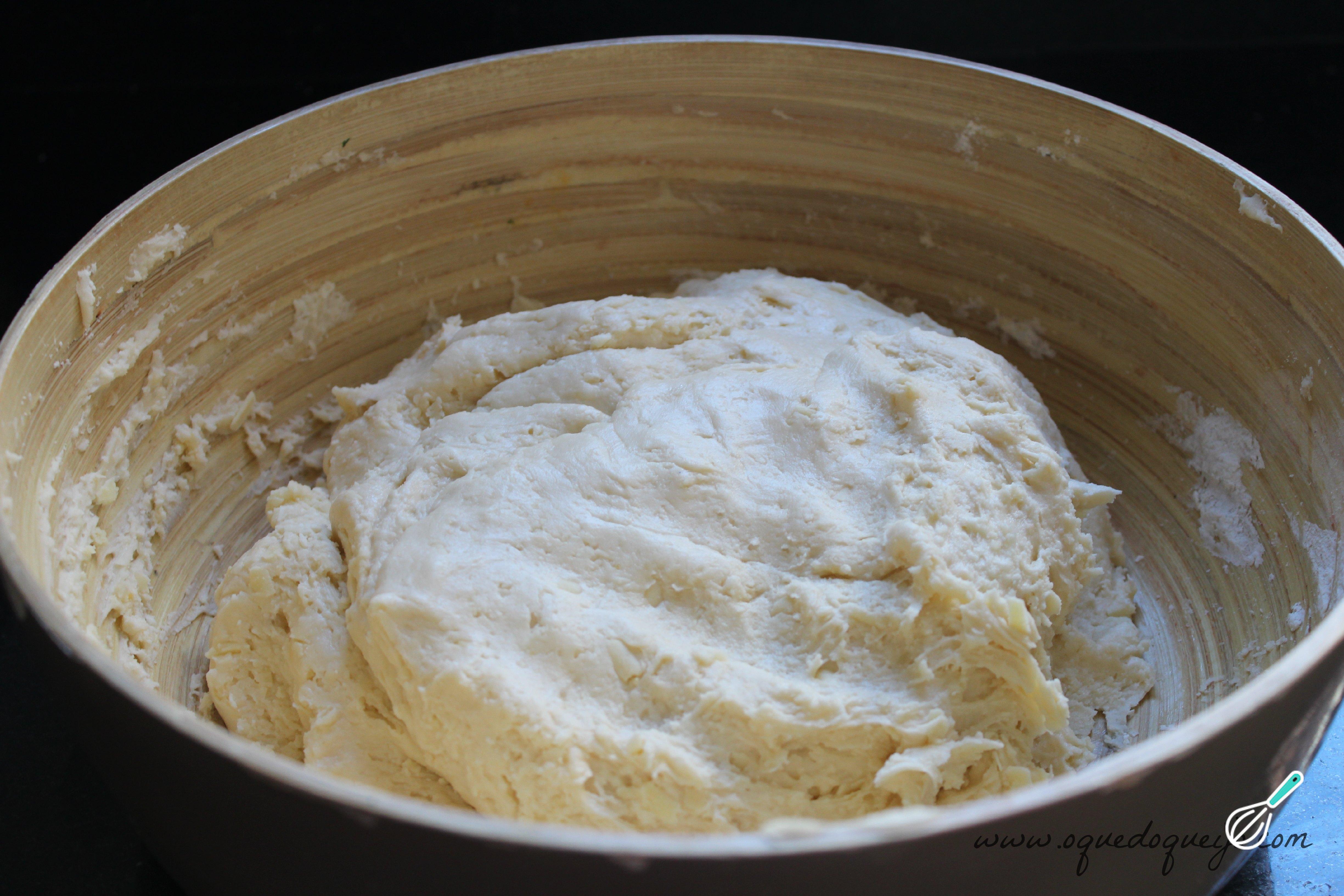 Para preparar pão de queijo recheado com chocolate, comece por peneirar o polvilho em uma vasilha. Aqueça o leite com o sal e a manteiga e despeje sobre a tigela com o polvilho. Mexa até obter uma mistura homogênea, deixe esfriar um pouco e junte o queijo e os ovos.