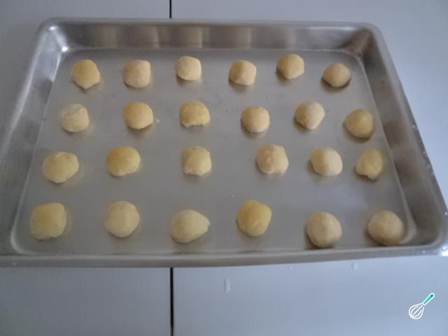 Com as mãos untadas de óleo, enrole o pão de queijo em bolinhas, colocando um cubinho de chocolate dentro de cada uma. Coloque o pão de queijo recheado com chocolate em uma assadeira untada e asse até dourar (cerca de 20 minutos)em forno médio preaquecido.