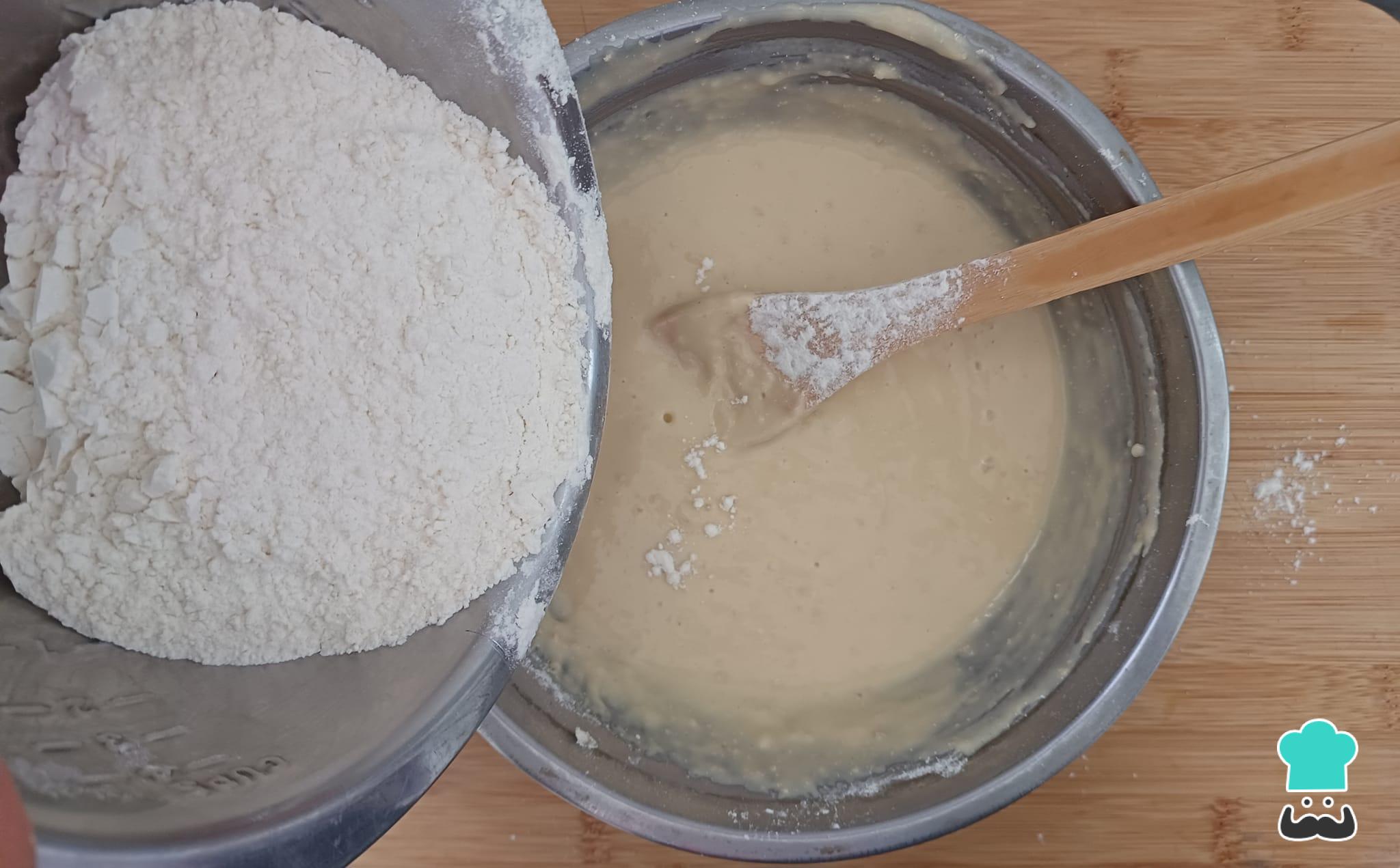 Vá acrescentando a farinha de trigo aos poucos, misturando com a colher de pau.