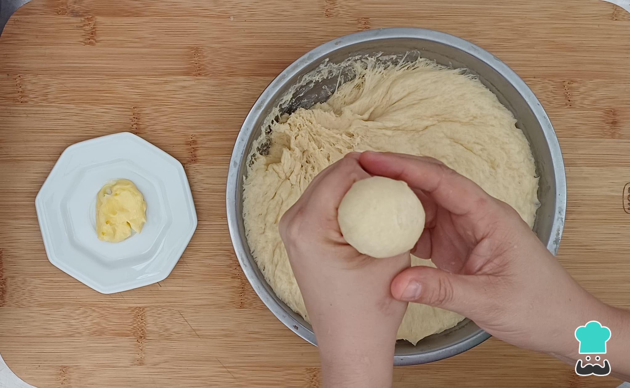 Após esse tempo, umedeça levemente as mãos com manteiga e pegue porções pequenas da massa, formando uma bola lisa, empurrando para cima com o auxílio do dedo indicador e polegar como se estivesse cortando-a.
