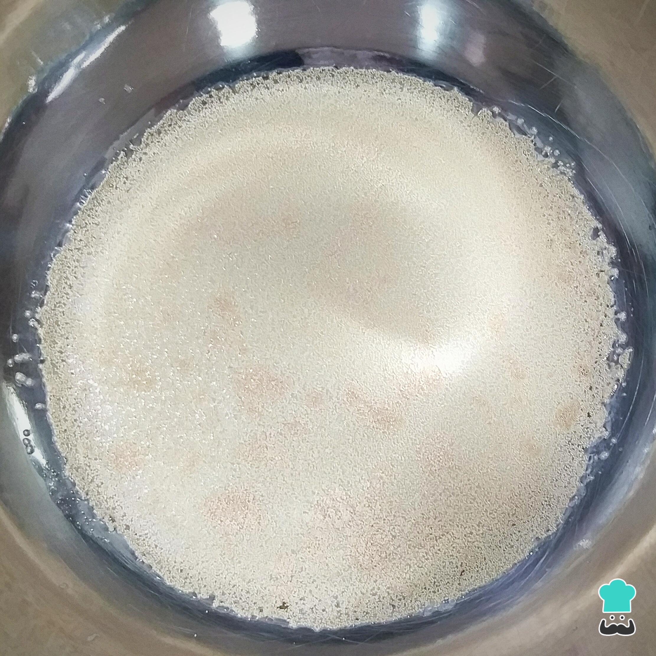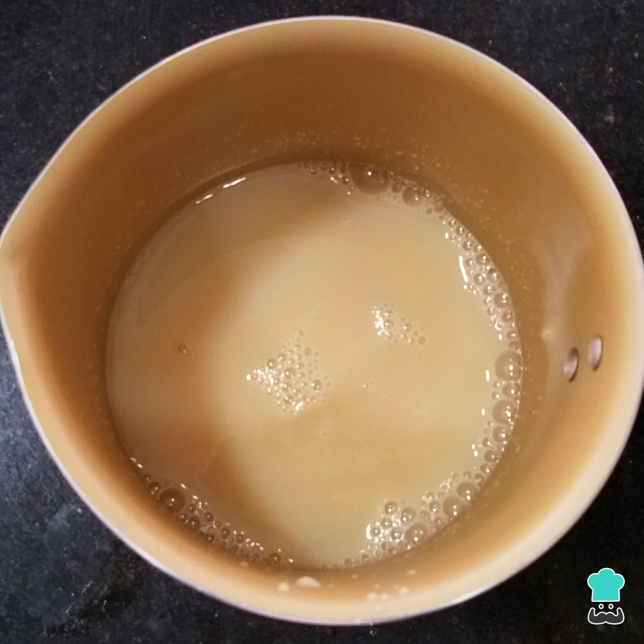Enquanto o pão está assando, prepare a calda: leve o açúcar e o leite ao fogo baixo, mexa de vez em quando e deixe ferver até engrossar.