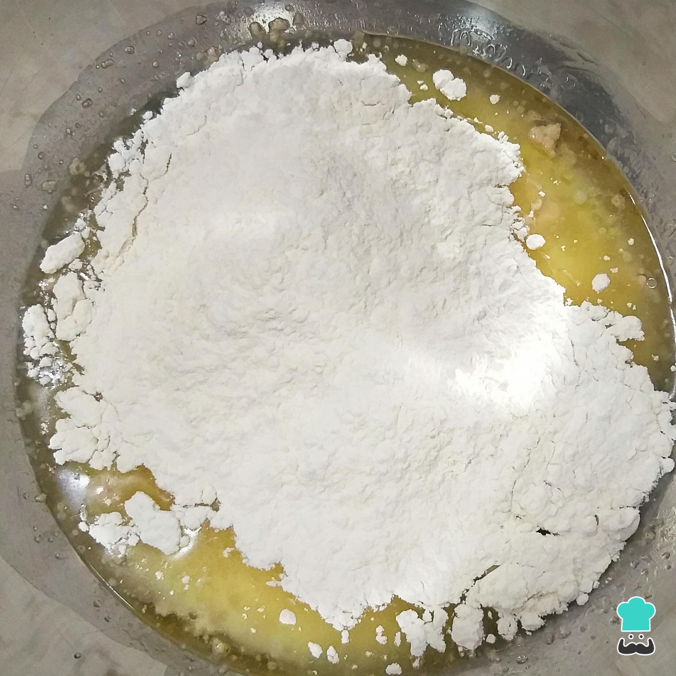 Coloque aos poucos a farinha peneirada, mexendo sempre com uma colher. A massa fica pesada, pelo que poderá ser necessário começar misturando com as mãos. Coloque o sal em último lugar.